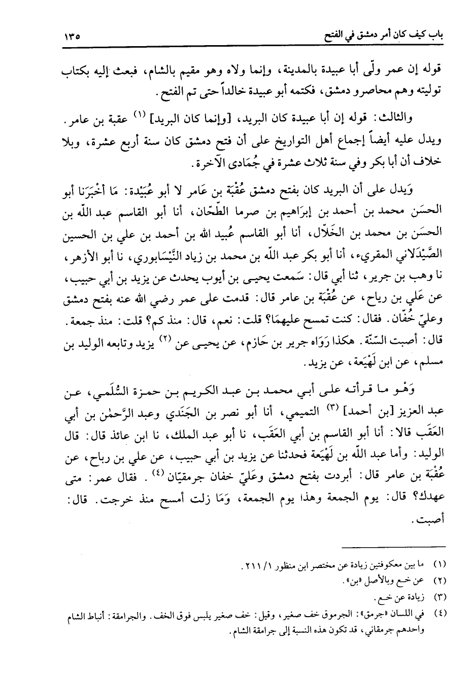 قوله إن عمر ولى أبا عبيدة بالمدينة وإنما ولاه وهو مقيم بالشام فبعث إليه بكتاب توليته وهم محاصرو دمشق فكتمه أبو عبيدة خالدا حتى تم الفتح والثالث قوله إن أبا عبيدة كان البريد وإنما كان البريد (1) عقبة بن عامر ويدل عليه أيضا إجماع أهل التواريخ على أن فتح دمشق كان سنة أربع عشرة وبلا خلاف أن أبا بكر وفي سنة ثلاث عشرة في جمادى الآخرة ويدل على أن البريد كان بفتح دمشق عقبة بن عامر لا أبو عبيدة ما أخبرنا أبو الحسن محمد بن أحمد بن إبراهيم بن صرما الطحان أنا أبو القاسم عبد الله بن الحسن بن محمد بن الخلال أنا أبو القاسم عبيد الله بن أحمد بن علي بن الحسين الصيدلاني المقرئ أنا أبو بكر عبد الله بن محمد بن زياد النيسابوري نا أبو الأزهر نا وهب بن جرير ثنا أبي قال سمعت يحيى بن أيوب يحدث عن يزيد بن أبي حبيب عن علي بن رياح عن عقبة بن عامر قال قدمت على عمر Bهـ بفتح دمشق وعلي خفان فقال كنت تمسح عليهما قلت نعم قال منذ كم قلت منذ جمعة قال أصبت السنة هكذا رواه جرير بن حازم عن يحيى عن (2) يزيد وتابعه الوليد بن مسلم عن ابن لهيعة عن يزيد وهو ما قرأته على أبي محمد بن عبد الكريم بن حمزة السلمي عن عبد العزيز بن أحمد (3) التميمي أنا أبو نصر بن الجندي وعبد الرحمن بن أبي العقب قالا انا أبو القاسم بن أبي العقب نا أبو عبد الملك نا ابن عائذ قال قال الوليد وأما عبد الله بن لهيعة فحدثنا عن يزيد بن أبي حبيب عن علي بن رباح عن عقبة بن عامر قال أبردت بفتح دمشق وعلي خفان جرمقيان (4) فقال عمر متى عهدك قال يوم الجمعة وهذا يوم الجمعة وما زلت أمسح منذ خرجت قال أصبت