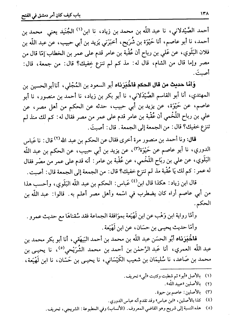 أحمد الصيدلاني نا عبد الله بن محمد بن زياد نا ابن (1) الجنيد يعني محمد بن أحمد نا أبو عاصم أنا حيوة بن شريح أخبرني يزيد بن أبي حبيب عن عبد الله بن فلان البلوي عن علي بن رباح أن عقبة بن عامر قدم على عمر بن الخطاب إما قال من مصر وإما قال من الشام قال له مذ كم لم تنزع خفيك قال من جمعة قال أصبت وأما حديث من قال الحكم فأخبرناه أبو السعود بن المجلي أنا أبو الحسين بن المهتدي أنا أبو القاسم الصيدلاني نا أبو بكر بن زياد نا أحمد بن منصور نا أبو عاصم عن حيوة عن يزيد بن أبي حبيب حدثه عن الحكم من أهل مصر عن علي بن رباح اللخمي أن عقبة بن عامر قدم على عمر من مصر فقال له كم لك منذ لم تنزع خفيك قال من الجمعة إلى الجمعة قال أصبت قال ونا أحمد بن منصور مرة أخرى فقال عن الحكم بن عبد الله (2) قال نا عباس الدوري نا أبو عاصم عن حيوة (3) عن يزيد بن أبي حبيب عن الحكم بن عبد الله البلوي عن علي بن رباح اللخمي عن عقبة بن عامر أنه قدم على عمر من مصر فقال له عمر كم لك يا عقبة مذ لم تنزع خفيك قال من الجمعة إلى الجمعة قال أصبت قال ابن زياد هكذا قال ابن (4) عباس الحكم بن عبد الله البلوي وأحسب هذا من أبي عاصم أراه كان يضطرب في اسمه وأهل مصر أعلم به قالوا عبد الله بن الحكم وأما رواية ابن وهب عن ابن لهيعة بموافقة الجماعة فقد سقناها مع حديث عمرو وأما حديث يحيى بن حسان عن ابن لهيعة فأخبرناه أبو الحسن عبد الله بن محمد بن أحمد البيهقي أنا أبو بكر محمد بن عبد الله العمري أنا عبد الرحمن بن أحمد بن محمد الشريحي (5) نا يحيى بن محمد بن صاعد نا سليمان بن شعيب الكيساني نا يحيى بن حسان نا ابن لهيعة