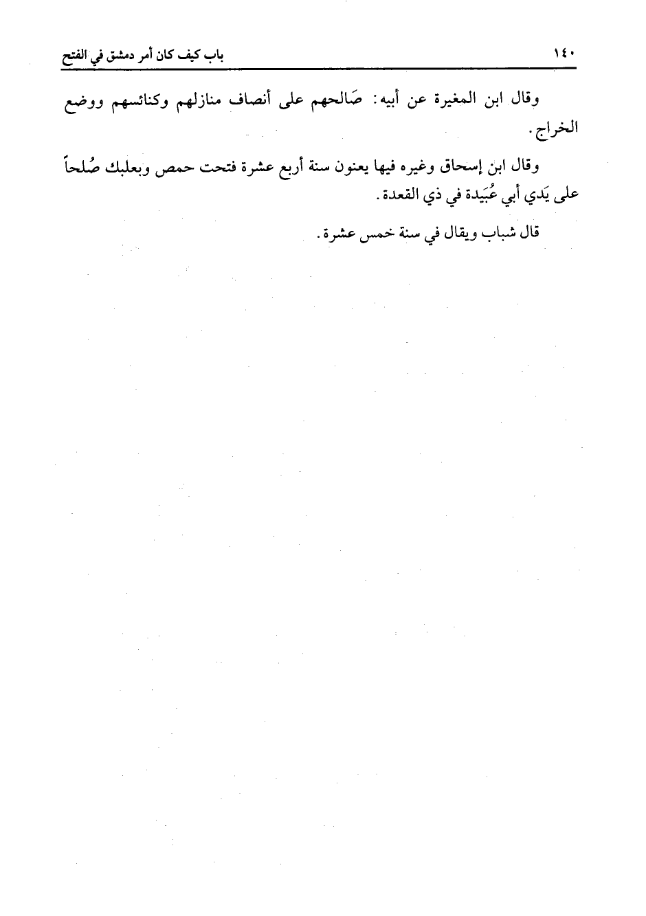 وقال ابن المغيرة عن أبيه صالحهم على أنصاف منازلهم وكنائسهم ووضع الخراج وقال ابن إسحاق وغيره فيها يعنون سنة أربع عشرة فتحت حمص وبعلبك صلحا على يدي أبي عبيدة في ذي القعدة قال شباب ويقال في سنة خمس عشرة