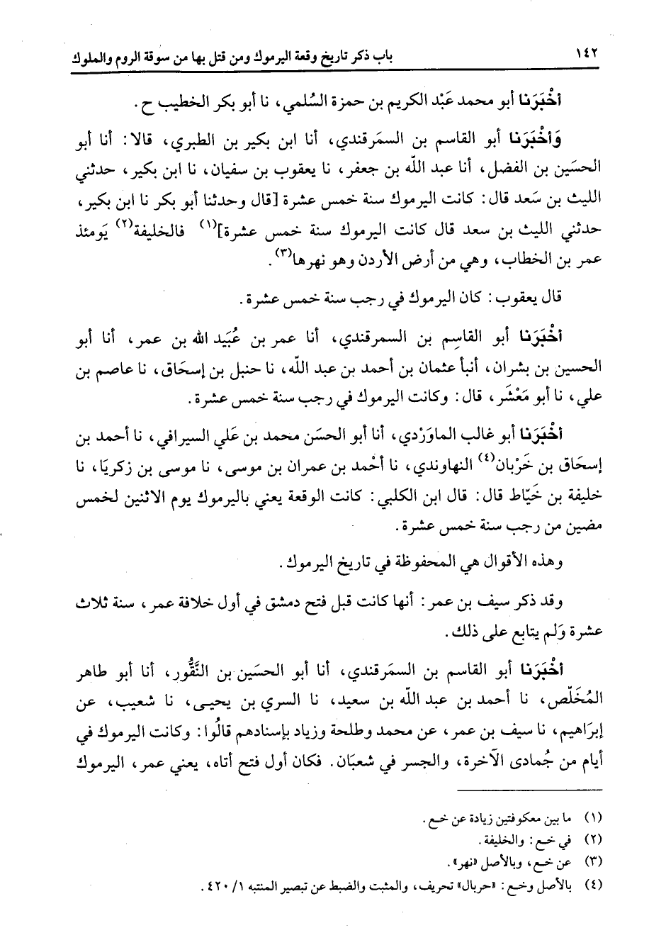 أخبرنا أبو محمد عبد الكريم بن حمزة السلمي نا أبو بكر الخطيب وأخبرنا أبو القاسم بن السمرقندي أنا ابن بكير بن الطبري قالا أنا أبو الحسين بن الفضل أنا عبد الله بن جعفر نا يعقوب بن سفيان نا ابن بكير حدثني الليث بن سعد قال كانت اليرموك سنة خمس عشرة قال وحدثنا أبو بكر نا ابن بكير حدثني الليث بن سعد قال كانت اليرموك سنة خمس عشرة (1) فالخليفة (2) يومئذ عمر بن الخطاب وهي من أرض الأردن وهو نهرها (3) قال يعقوب كان اليرموك في رجب سنة خمس عشرة أخبرنا أبو القاسم بن السمرقندي أنا عمر بن عبيد الله بن عمر أنا أبو الحسين بن بشران أنبأ عثمان بن أحمد بن عبد الله نا حنبل بن إسحاق نا عاصم بن علي نا أبو معشر قال وكانت اليرموك في رجب سنة خمس عشرة أخبرنا أبو غالب الماوردي أنا أبو الحسن محمد بن علي السيرافي نا أحمد بن إسحاق بن خربان (4) النهاوندي نا أحمد بن عمران بن موسى نا موسى بن زكريا نا خليفة بن خياط قال قال ابن الكلبي كانت الوقعة يعني باليرموك يوم الاثنين لخمس مضين من رجب سنة خمس عشرة وهذه الأقوال هي المحفوظة في تاريخ اليرموك وقد ذكر سيف بن عمر أنها كانت قبل فتح دمشق في أول خلافة عمر سنة ثلاث عشرة ولم يتابع على ذلك أخبرنا أبو القاسم بن السمرقندي أنا أبو الحسين بن النقور أنا أبو طاهر المخلص نا أحمد بن عبد الله بن سعيد نا السري بن يحيى نا شعيب عن إبراهيم نا سيف بن عمر عن محمد وطلحة وزياد بإسنادهم قالوا وكانت اليرموك في أيام من جمادى الآخرة والجسر في شعبان فكان أول فتح أتاه يعني عمر اليرموك