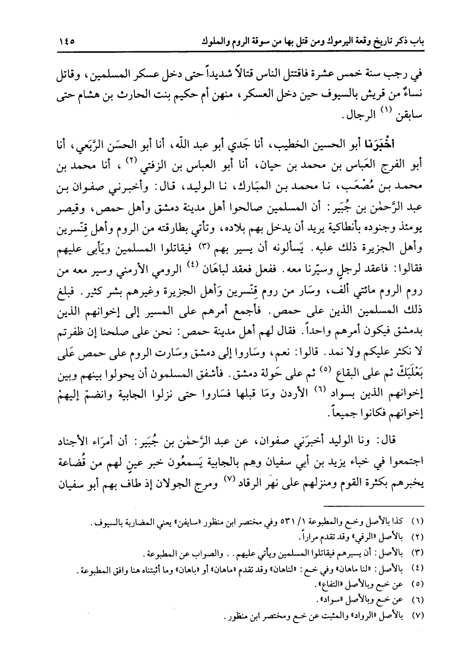 في رجب سنة خمس عشرة فاقتتل الناس قتالا شديدا حتى دخل عسكر المسلمين وقاتل نساء من قريش بالسيوف حين دخل العسكر منهن أم حكيم بنت الحارث بن هشام حتى سابقن (1) الرجال أخبرنا أبو الحسين الخطيب أنا جدي أبو عبد الله أنا أبو الحسن الربعي أنا أبو الفرج العباس بن محمد بن حيان أنا أبو العباس بن الزفتي (2) أنا محمد بن محمد بن مصعب نا محمد بن المبارك نا الوليد قال وأخبرني صفوان بن عبد الرحمن بن جبير أن المسلمين صالحوا أهل مدينة دمشق وأهل حمص وقيصر يومئذ وجنوده بأنطاكية يريد أن يدخل بهم بلاده وتأتي بطارقته من الروم وأهل قنسرين وأهل الجزيرة ذلك عليه يسألونه أن يسير بهم (3) فيقاتلوا المسلمين ويأبى عليهم فقالوا فاعقد لرجل وسيرنا معه ففعل فعقد لباهان (4) الرومي الأرمني وسير معه من روم الروم مائتي ألف وسار من روم قنسرين وأهل الجزيرة وغيرهم بشر كثير فبلغ ذلك المسلمين الذين على حمص فأجمع أمرهم على المسير إلى إخوانهم الذين بدمشق فيكون أمرهم واحدا فقال لهم أهل مدينة حمص نحن على صلحنا إن ظفرتم لا نكثر عليكم ولا نمد قالوا نعم وساروا إلى دمشق وسارت الروم على حمص على بعلبك ثم على البقاع (5) ثم على حولة دمشق فأشفق المسلمون أن يحولوا بينهم وبين إخوانهم الذين بسواد (6) الأردن وما قبلها فساروا حتى نزلوا الجابية وانضم إليهم إخوانهم فكانوا جميعا قال ونا الوليد أخبرني صفوان عن عبد الرحمن بن جبير أن أمراء الأجناد اجتمعوا في خباء يزيد بن أبي سفيان وهم بالجابية يسمعون خبر عين لهم من قضاعة يخبرهم بكثرة القوم ومنزلهم على نهر الرقاد (7) ومرج الجولان إذ طاف بهم أبو سفيان