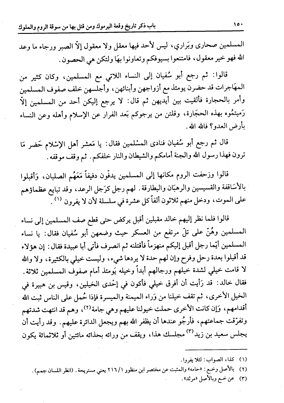 المسلمين صحارى وبراري ليس لأحد فيها معقل ولا معقول إلا الصبر ورجاء ما وعد الله فهو خير معقول فامتنعوا بسيوفكم وتعاونوا بها ولتكن هي الحصون قالوا ثم رجع أبو سفيان إلى النساء اللاتي مع المسلمين وكان كثير من المهاجرات قد حضرت يومئذ مع أزواجهن وأبنائهن وأجلسهن خلف صفوف المسلمين وأمر بالحجارة فألقيت بين أيديهن ثم قال لا يرجع إليكن أحد من المسلمين إلا رميتموه بهذه الحجارة وقلتن من يرجوكم بعد الفرار عن الإسلام وأهله وعن النساء بأرض العدو فالله الله قال ثم رجع أبو سفيان فنادى المسلمين فقال يا معشر أهل الإسلام حضر ما ترون فهذا رسول الله والجنة أمامكم والشيطان والنار خلفكم ثم وقف موقفه قالوا وزحفت الروم مكانها إلى المسلمين يدفون دفيفا معهم الصلبان وأقبلوا بالأساقفة والقسيسين والرهبان والبطارقة لهم رجل كرجل الرعد وقد تبايع عظماؤهم على الموت ودخل منهم ثلاثون ألفا كل عشرة في سلسلة لأن لا يفرون (1) قالوا فلما نظر إليهم خالد مقبلين أقبل يركض حتى قطع صف المسلمين إلى نساء المسلمين وهن على تل مرتفع من العسكر حيث وضعهن أبو سفيان فقال يا نساء المسلمين أيما رجل أقبل إليكم منهزما فأقتلنه ثم انصرف فأتى أبا عبيدة فقال إن هؤلاء قد أقبلوا بعدة رحل وفرح وإن لهم حدة لا يردها شئ وليست خيلي بالكثيرة ولا والله لا قامت خيلي لشدة خيلهم ورجالهم أبدا وخيله يومئذ أمام صفوف المسلمين ثلاثة فقال خالد قد رأيت أن أفرق خيلي فأكون في إحدى الخيلين وقيس بن هبيرة في الخيل الأخرى ثم تقف خيلنا من وراء الميمنة والميسرة فإذا حمل على الناس ثبت الله أقدامهم وإن كانت الأخرى حملت خيولنا عليهم وهي جامة (2) وهم قد انتهت شدتهم وتفرقت جماعتهم فأرجو عندها أن يظفر الله بهم ويجعل الدائرة عليهم وقد رأيت أن يجلس سعيد بن زيد (3) مجلسك هذا ويقف من ورائه بحذائه مائتين أو ثلاثمائة يكون