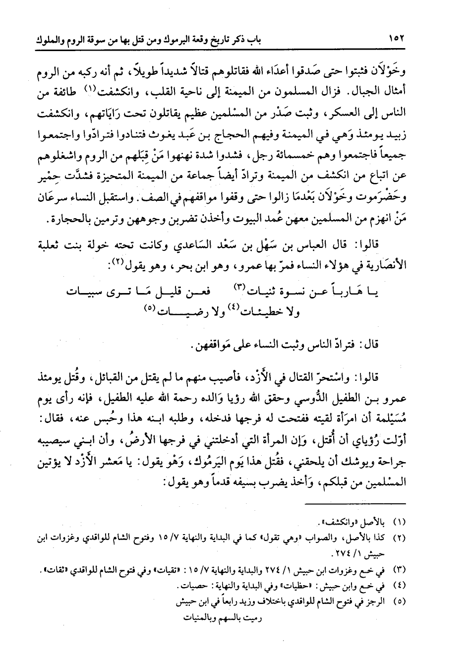 وخولان فثبتوا حتى صدقوا أعداء الله فقاتلوهم قتالا شديدا طويلا ثم أنه ركبه من الروم أمثال الجبال فزال المسلمون من الميمنة إلى ناحية القلب وانكشفت (1) طائفة من الناس إلى العسكر وثبت صدر من المسلمين عظيم يقاتلون تحت راياتهم وانكشفت زبيد يومئذ وهي في الميمنة وفيهم الحجاج بن عبد يغوث فتنادوا فترادوا واجتمعوا جميعا فاجتمعوا وهم خمسمائة رجل فشدوا شدة نهنهوا من قبلهم من الروم واشغلوهم عن اتباع من انكشف من الميمنة وتراد أيضا جماعة من الميمنة المتحيزة فشدت حمير وحضرموت وخولان بعدما زالوا حتى وقفوا مواقفهم في الصف واستقبل النساء سرعان من انهزم من المسلمين معهن عمد البيوت وأخذن تضربن وجوههن وترمين بالحجارة قالوا قال العباس بن سهل بن سعد الساعدي وكانت تحته خولة بنت ثعلبة الأنصارية في هؤلاء النساء فمر بها عمرو وهو ابن بحر وهو يقول (2) : يا هاربا عن نسوة ثنيات (3) * فعن قليل ما ترى سبيات * ولا خطيئات (4) ولا رضيات (5) * قال فتراد الناس وثبت النساء على مواقفهن قالوا واستحر القتال في الأزد فأصيب منهم ما لم يقتل من القبائل وقتل يومئذ عمرو بن الطفيل الدوسي وحقق الله رؤيا والده رحمة الله عليه الطفيل فإنه رأى يوم مسيلمة أن امرأة لقيته ففتحت له فرجها فدخله وطلبه ابنه هذا وحبس عنه فقال أولت رؤياي أن أقتل وأن المرأة التي أدخلتني في فرجها الأرض وأن ابني سيصيبه جراحة ويوشك أن يلحقني فقتل هذا يوم اليرموك وهو يقول يا معشر الأزد لا يؤتين المسلمين من قبلكم وأخذ يضرب بسيفه قدما وهو يقول: