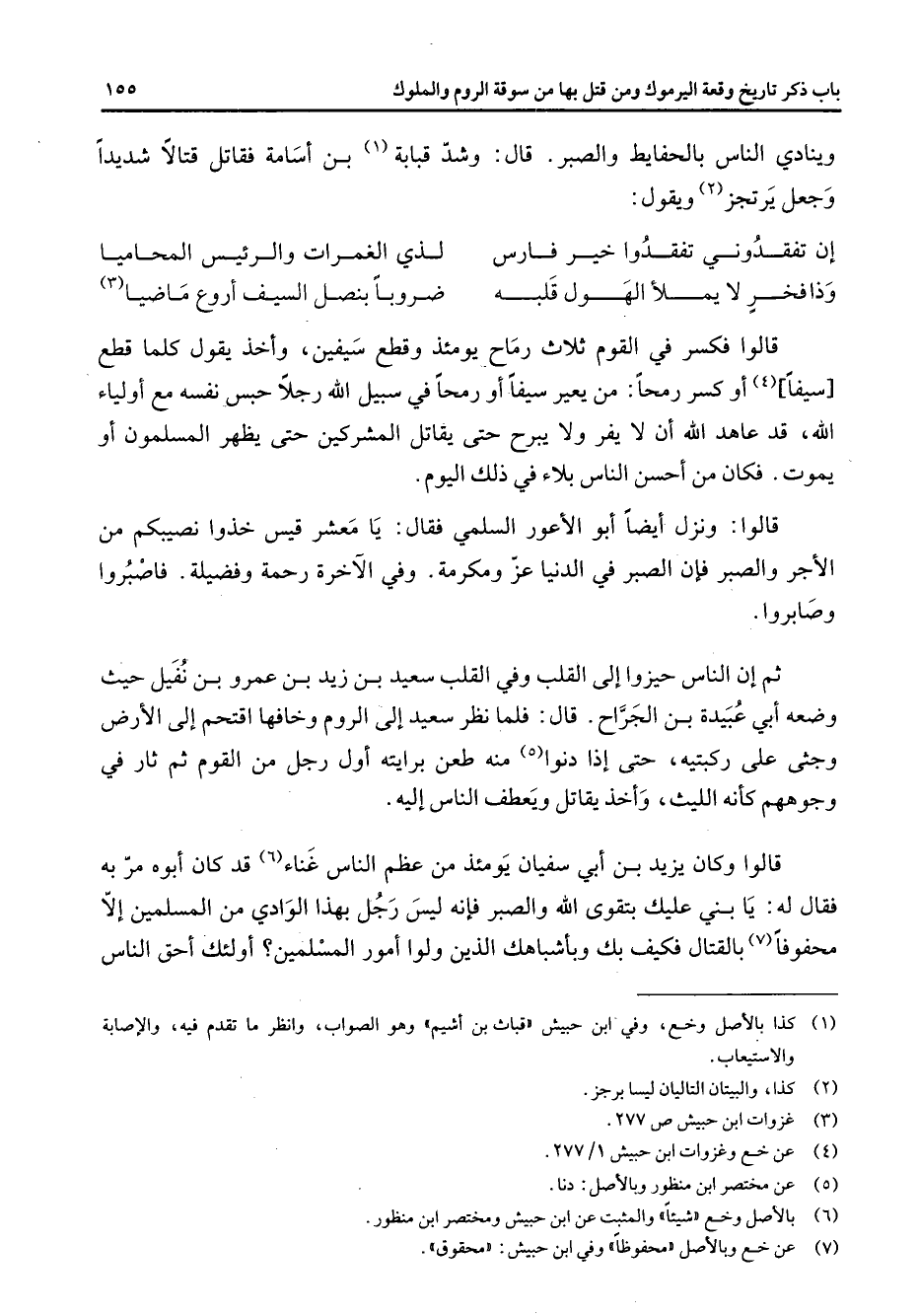 وينادي الناس بالحفايط والصبر قال وشد قبابة (1) بن أسامة فقاتل قتالا شديدا وجعل يرتجز (2) ويقول: إن تفقدوني تفقدوا خير فارس * لذي الغمرات والرئيس المحاميا وذا فخر لا يملأ الهول قلبه * ضروبا بنصل السيف أروع ماضيا (3) قالوا فكسر في القوم ثلاث رماح يومئذ وقطع سيفين وأخذ يقول كلما قطع سيفا (4) أو كسر رمحا من يعير سيفا أو رمحا في سبيل الله رجلا حبس نفسه مع أولياء الله قد عاهد الله أن لا يفر ولا يبرح حتى يقاتل المشركين حتى يظهر المسلمون أو يموت فكان من أحسن الناس بلاء في ذلك اليوم قالوا ونزل أيضا أبو الأعور السلمي فقال يا معشر قيس خذوا نصيبكم من الأجر والصبر فإن الصبر في الدنيا عز ومكرمة وفي الآخرة رحمة وفضيلة فاصبروا وصابروا ثم إن الناس حيزوا إلى القلب وفي القلب سعيد بن زيد بن عمرو بن نفيل حيث وضعه أبي عبيدة بن الجراح قال فلما نظر سعيد إلى الروم وخافها اقتحم إلى الأرض وجثى على ركبتيه حتى إذا دنوا (5) منه طعن برايته أول رجل من القوم ثم ثار في وجوههم كأنه الليث وأخذ يقاتل ويعطف الناس إليه قالوا وكان يزيد بن أبي سفيان يومئذ من عظم الناس غناء (6) قد كان أبوه مر به فقال له يا بني عليك بتقوى الله والصبر فإنه ليس رجل بهذا الوادي من المسلمين إلا محفوفا (7) بالقتال فكيف بك وبأشباهك الذين ولوا أمور المسلمين أولئك أحق الناس