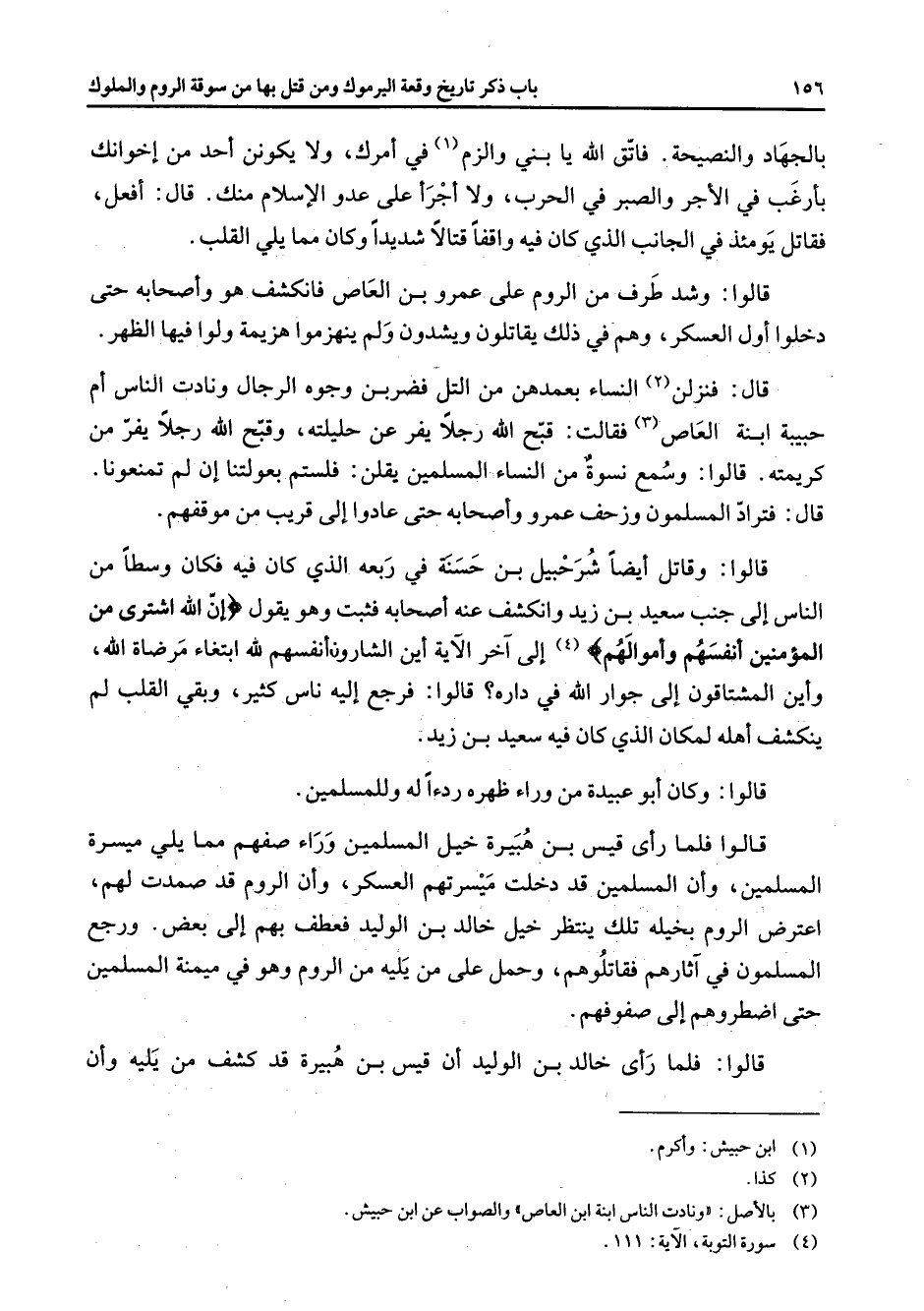 قال فتراد المسلمون وزحف عمرو وأصحابه حتى عادوا إلى قريب من موقفهم قالوا وقاتل أيضا شرحبيل بن حسنة في ربعه الذي كان فيه فكان وسطا من الناس إلى جنب سعيد بن زيد وانكشف عنه أصحابه فثبت وهو يقول " إن الله اشترى من المؤمنين أنفسهم وأموالهم " (4) إلى آخر الآية أين الشارون أنفسهم لله ابتغاء مرضاة الله وأين المشتاقون إلى جوار الله في داره قالوا فرجع إليه ناس كثير وبقي القلب لم ينكشف أهله لمكان الذي كان فيه سعيد بن زيد قالوا وكان أبو عبيدة من وراء ظهره ردءا له وللمسلمين قالوا فلما رأى قيس بن هبيرة خيل المسلمين وراء صفهم مما يلي ميسرة المسلمين وأن المسلمين قد دخلت ميسرتهم العسكر وأن الروم قد صمدت لهم اعترض الروم بخيله تلك ينتظر خيل خالد بن الوليد فعطف بهم إلى بعض ورجع المسلمون في آثارهم فقاتلوهم وحمل على من يليه من الروم وهو في ميمنة المسلمين حتى اضطروهم إلى صفوفهم قالوا فلما رأى خالد بن الوليد أن قيس بن هبيرة قد كشف من يليه وأن
