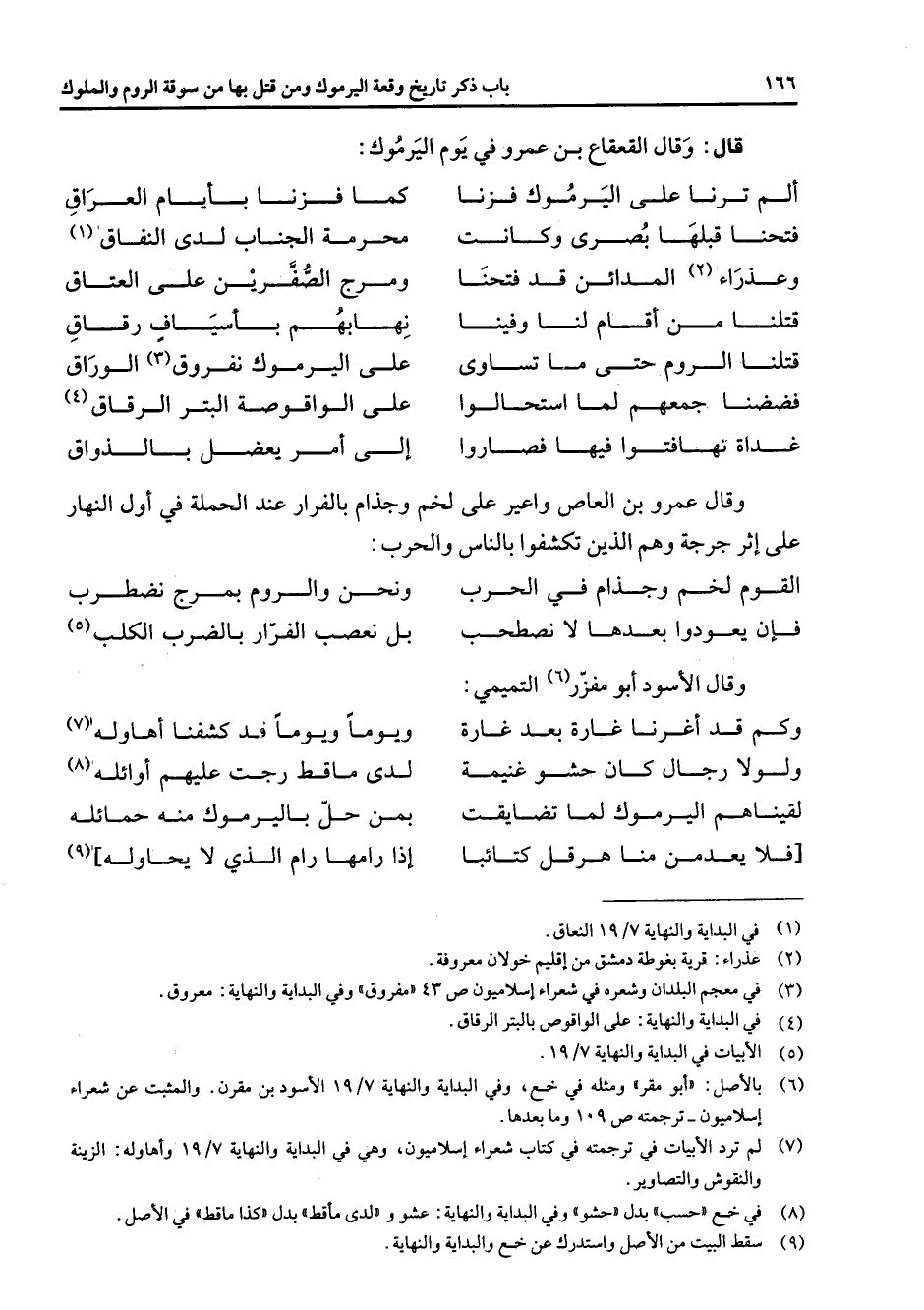 قال وقال القعقاع بن عمرو في يوم اليرموك: ألم ترنا على اليرموك فزنا * كما فزنا بأيام العراق فتحنا قبلها بصرى وكانت * محرمة الجناب لدى النفاق (1) وعذراء (2) المدائن قد فتحنا * ومرج الصفرين على العتاق قتلنا من أقام لنا وفينا * نهابهم بأسياف رقاق قتلنا الروم حتى ما تساوى * على اليرموك نفروق (3) الوراق فضضنا جمعهم لما استحالوا * على الواقوصة البتر الرقاق (4) غداة تهافتوا فيها فصاروا * إلى أمر يعضل بالذواق وقال عمرو بن العاص واعير على لخم وجذام بالفرار عند الحملة في أول النهار على إثر جرجة وهم الذين تكشفوا بالناس والحرب: القوم لخم وجذام في الحرب * ونحن والروم بمرج نضطرب فإن يعودوا بعدها لا نصطحب * بل نعصب الفرار بالضرب الكلب (5) وقال الأسود أبو مفزر (6) التميمي: وكم قد أغرنا غارة بعد غارة * ويوما ويوما قد كشفنا أهاوله (7) ولولا رجال كان حشو غنيمة * لدى ماقط رجت عليهم أوائله (8) لقيناهم اليرموك لما تضايقت * بمن حل باليرموك منه حمائله [فلا يعدمن منا هرقل كتائبا * إذا رامها رام الذي لا يحاوله] (9)