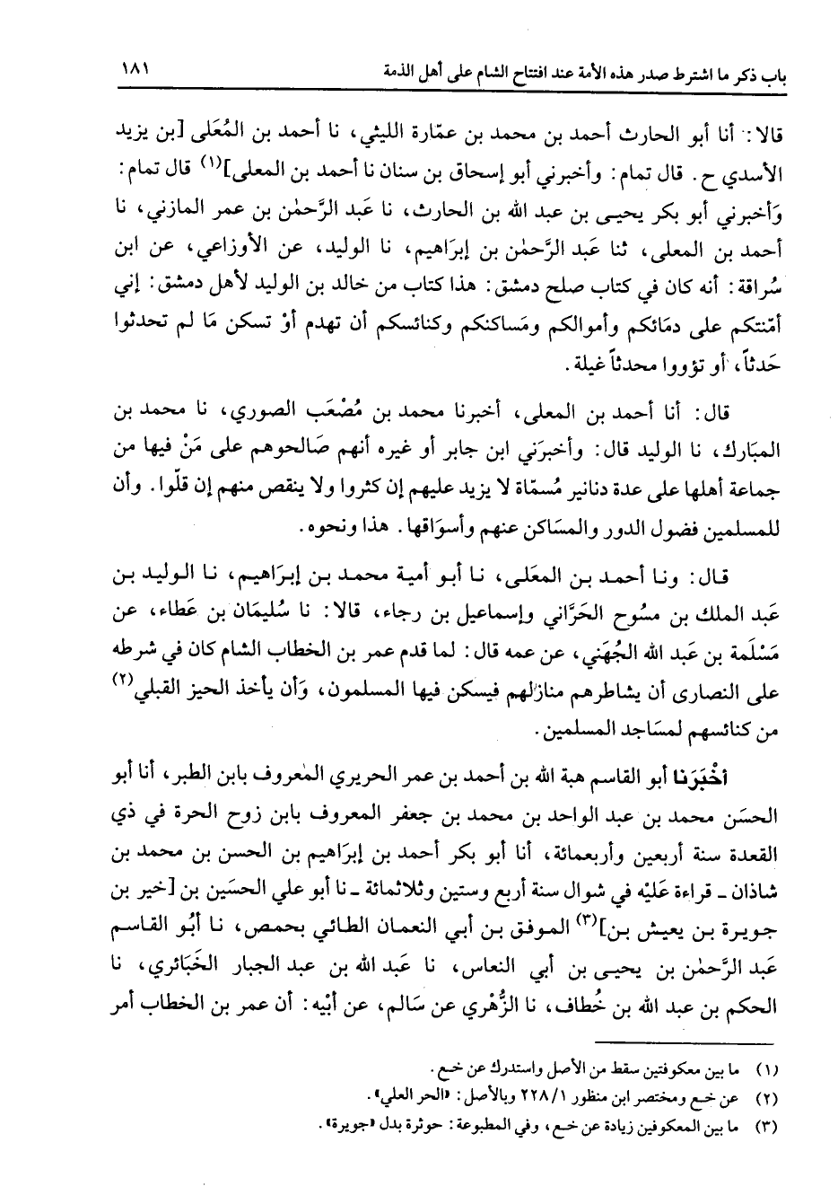 قالا أنا أبو الحارث أحمد بن محمد بن عمارة الليثي نا أحمد بن المعلى بن يزيد الأسدي قال تمام وأخبرني أبو إسحاق بن سنان نا أحمد بن المعلى (1) قال تمام وأخبرني أبو بكر يحيى بن عبد الله بن الحارث نا عبد الرحمن بن عمر المازني نا أحمد بن المعلى ثنا عبد الرحمن بن إبراهيم نا الوليد عن الأوزاعي عن ابن سراقة أنه كان في كتاب صلح دمشق هذا كتاب من خالد بن الوليد لأهل دمشق إني أمنتكم على دمائكم وأموالكم ومساكنكم وكنائسكم أن تهدم أو تسكن ما لم تحدثوا حدثا أو تؤووا محدثا غيلة قال أنا أحمد ببن المعلى أخبرنا محمد بن مصعب الصوري نا محمد بن المبارك نا الوليد قال وأخبرني ابن جابر أو غيره أنهم صالحوهم على من فيها من جماعة أهلها على عدة دنانير مسماة لا يزيد عليهم إن كثروا ولا ينقص منهم إن قلوا وأن للمسلمين فضول الدور والمساكن عنهم وأسواقها هذا ونحوه قال ونا أحمد بن المعلى نا أبو أمية محمد بن إبراهيم نا الوليد بن عبد الملك بن مسوح الحراني وإسماعيل بن رجاء قالا نا سليمان بن عطاء عن مسلمة بن عبد الله الجهني عن عمه قال لما قدم عمر بن الخطاب الشام كان في شرطه على النصارى أن يشاطرهم منازلهم فيسكن فيها المسلمون وأن يأخذ الحيز القبلي (2) من كنائسهم لمساجد المسلمين أخبرنا أبو القاسم هبة الله بن أحمد بن عمر الحريري المعروف بابن الطبر أنا أبو الحسن محمد بن عبد الواحد بن محمد بن جعفر المعروف بابن زوح الحرة في ذي القعدة سنة أربعين وأربعمائة أنا أبو بكر أحمد بن إبراهيم بن الحسن بن محمد بن شاذان قراءة عليه في شوال سنة أربع وستين وثلاثمائة نا أبو علي الحسين بن خير بن جويرة بن يعيش بن (3) الموفق بن أبي النعمان الطائي بحمص نا أبو القاسم عبد الرحمن بن يحيى بن أبي النعاس نا عبد الله بن عبد الجبار الخبائري نا الحكم بن عبد الله بن خطاف نا الزهري عن سالم عن أبيه أن عمر بن الخطاب أمر