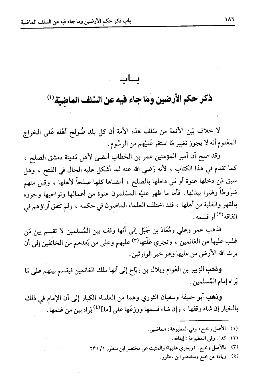 " باب ذكر حكم الأرضين وما جاء فيه عن السلف الماضية " (1) لا خلاف بين الأئمة من سلف هذه الأمة أن كل بلد صولح أهله على الخراج المعلوم أنه لا يجوز تغيير ما استقر عليهم من الرسوم وقد صح أن أمير المؤمنين عمر بن الخطاب أمضى لأهل مدينة دمشق الصلح كما تقدم في هذا الكتاب لأنه Bهـ لما أشكل عليه الحال في الفتح وهل سبق من دخلها عنوة أو من دخلها بالصلح أمضاها كلها صلحا لأهلها وقبل منهم شروطا رضوا ببذلها فأما ما ظهر عليه المسلمون عنوة من أعمالها ونواحيها وحووه بالقهر والغلبة من أهلها فقد اختلف العلماء الماضون في حكمه ولم تتفق آراؤهم في انفاقه (2) أو قسمه فذهب عمر وعلي ومعاذ بن جبل إلى أنها وقف بين المسلمين لا تقسم بين من غلب عليها من الغانمين وتجري غلتها (3) عليهم وعلى من بعدهم من الخائفين إلى أن يرث الله الأرض ومن عليها وهو خير الوارثين وذهب الزبير بن العوام وبلال بن رباح إلى أنها ملك الغانمين فيقسم بينهم على ما يراه إمام المسلمين وذهب أبو حنيفة وسفيان الثوري وهما من العلماء الكبار إلى أن الإمام في ذلك بالخيار إن شاء وقفها وإن شاء قسمها ووزعها على ما (4) يراه بين من غنمها
