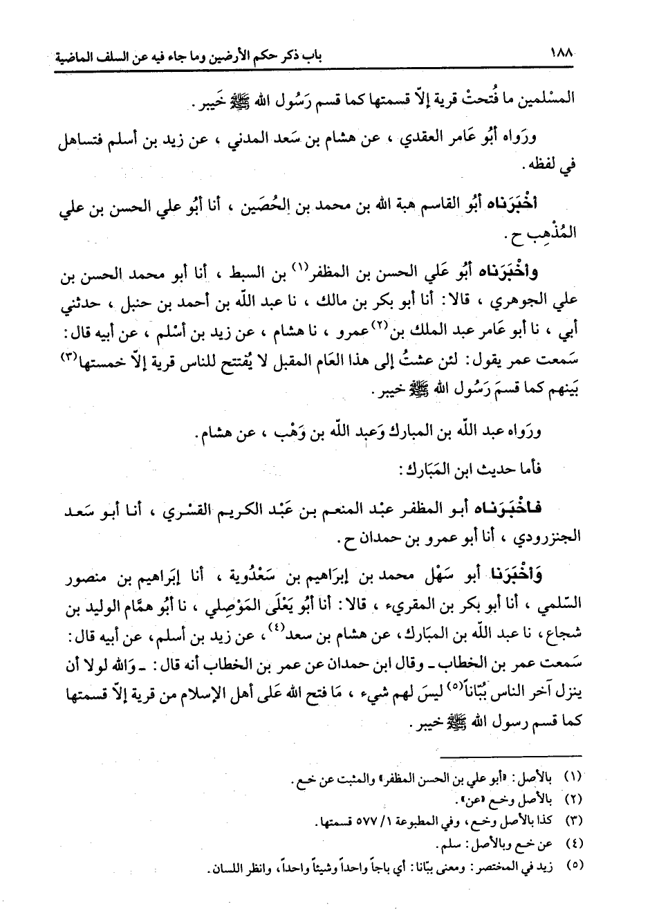 المسلمين ما فتحت قرية إلا قسمتها كما قسم رسول الله (صلى الله عليه وسلم) خيبر ورواه أبو عامر العقدي عن هشام بن سعد المدني عن زيد بن أسلم فتساهل في لفظه أخبرناه أبو القاسم هبة الله بن محمد بن الحصين أنا أبو علي الحسن بن علي المذهب وأخبرناه أبو علي الحسن بن المظفر (1) بن السبط أنا أبو محمد الحسن بن علي الجوهري قالا أنا أبو بكر بن مالك نا عبد الله بن أحمد بن حنبل حدثني أبي نا أبو عامر عبد الملك بن (2) عمرو نا هشام عن زيد بن أسلم عن أبيه قال سمعت عمر يقول لئن عشت إلى هذا العام المقبل لا يفتتح للناس قرية إلا خمستها (3) بينهم كما قسم رسول الله (صلى الله عليه وسلم) خيبر ورواه عبد الله بن المبارك وعبد الله بن وهب عن هشام فأما حديث ابن المبارك فأخبرناه أبو المظفر عبد المنعم بن عبد الكريم القسري أنا أبو سعد الجنزرودي أنا أبو عمرو بن حمدان وأخبرنا أبو سهل محمد بن إبراهيم بن سعدوية أنا إبراهيم بن منصور السلمي أنا أبو بكر بن المقرئ قالا أنا أبو يعلى الموصلي نا أبو همام الوليد بن شجاع نا عبد الله بن المبارك عن هشام بن سعد (4) عن زيد بن أسلم عن أبيه قال سمعت عمر بن الخطاب وقال ابن حمدان عن عمر بن الخطاب أنه قال والله لولا أن ينزل آخر الناس ببانا (5) ليس لهم شئ ما فتح الله على أهل الإسلام من قرية إلا قسمتها كما قسم رسول الله (صلى الله عليه وسلم) خيبر