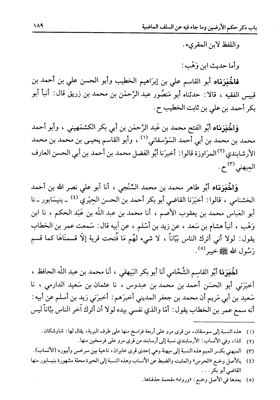 واللفظ لابن المقرئ وأما حديث ابن وهب فأخبرناه أبو القاسم علي بن إبراهيم الخطيب وأبو الحسن علي بن أحمد بن قبيس الفقيه قالا حدثناه أبو منصور عبد الرحمن بن محمد بن زريق قال أنبأ أبو بكر أحمد بن علي بن ثابت الخطيب وأخبرناه أبو الفتح محمد بن عبد الرحمن بن أبي بكر الكشمهيني وأبو أحمد محمد بن محمد بن أبي أحمد السوسقاني (1) وأبو القاسم يحيى بن محمد بن محمد الأرشابندي (2) المراوزة قالوا أخبرنا أبو الفضل محمد بن أحمد بن أبي الحسن العارف الميهني (3) وأخبرناه أبو طاهر محمد بن محمد السنجي أنا أبو علي نصر الله بن أحمد الخشنامي قالوا أخبرنا القاضي أبو بكر أحمد بن الحسن الحيري (4) بنيسابور نا أبو العباس محمد بن يعقوب الأصم أنا محمد بن عبد الله بن عبد الحكم نا ابن وهب أنبأ هشام بن سعد عن زيد بن أسلم عن أبيه قال سمعت عمر بن الخطاب يقول لولا أني أترك الناس ببانا لا شئ لهم ما فتحت قرية إلا قسمناها كما قسم رسول الله (صلى الله عليه وسلم) خيبر (5) أخبرنا أبو القاسم الشحامي أنا أبو بكر البيهقي أنا محمد بن عبد الله الحافظ أخبرني أبو الحسن أحمد بن محمد بن عبدوس نا عثمان بن سعيد الدارمي نا سعيد بن أبي مريم أن محمد بن جعفر المديني أخبرهم أخبرني زيد بن أسلم عن أبيه أنه سمع عمر بن الخطاب يقول أما والذي نفسي بيده لولا أن أترك آخر الناس ببانا ليس
