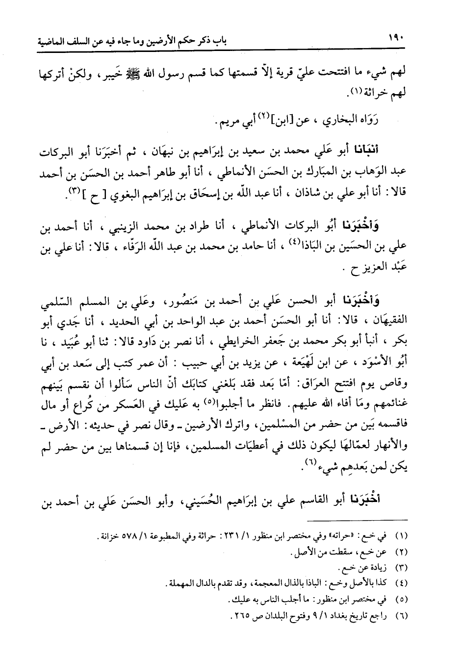 لهم شئ ما افتتحت علي قرية إلا قسمتها كما قسم رسول الله (صلى الله عليه وسلم) خيبر ولكن أتركها لهم خراثة (1) رواه البخاري عن ابن (2) أبي مريم أنبأنا أبو علي محمد بن سعيد بن إبراهيم بن نبهان ثم أخبرنا أبو البركات عبد الوهاب بن المبارك بن الحسن الأنماطي أنا أبو طاهر أحمد بن الحسن بن أحمد قالا أنا أبو علي بن شاذان أنا عبد الله بن إسحاق بن إبراهيم البغوي (3) وأخبرنا أبو البركات الأنماطي أنا طراد بن محمد الزينبي أنا أحمد بن علي بن الحسين بن الباذا (4) أنا حامد بن محمد بن عبد الله الرفاء قالا أنا علي بن عبد العزيز وأخبرنا أبو الحسن علي بن أحمد بن منصور وعلي بن المسلم السلمي الفقيهان قالا أنا أبو الحسن أحمد بن عبد الواحد بن أبي الحديد أنا جدي أبو بكر أنبأ أبو بكر محمد بن جعفر الخرايطي أنا نصر بن داود قالا ثنا أبو عبيد نا أبو الأسود عن ابن لهيعة عن يزيد بن أبي حبيب أن عمر كتب إلى سعد بن أبي وقاص يوم افتتح العراق أما بعد فقد بلغني كتابك أن الناس سألوا أن نقسم بينهم غنائمهم وما أفاء الله عليهم فانظر ما أجلبوا (5) به عليك في العسكر من كراع أو مال فاقسمه بين من حضر من المسلمين واترك الأرضين وقال نصر في حديثه الأرض والأنهار لعمالها ليكون ذلك في أعطيات المسلمين فإنا إن قسمناها بين من حضر لم يكن لمن بعدهم شئ (6) أخبرنا أبو القاسم علي بن إبراهيم الحسيني وأبو الحسن علي بن أحمد بن