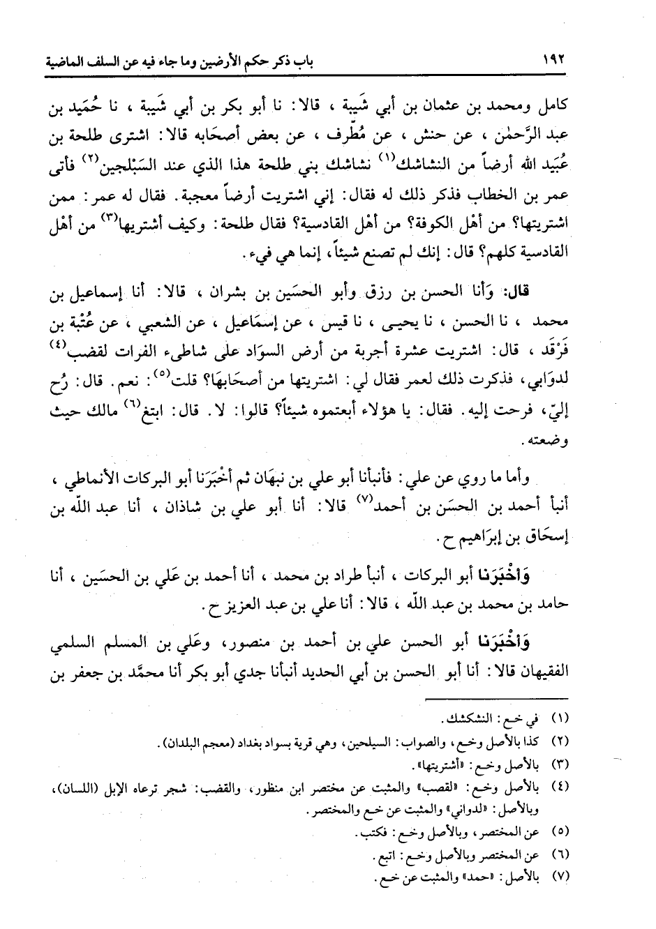 كامل ومحمد بن عثمان بن أبي شيبة قالا نا أبو بكر بن أبي شيبة نا حميد بن عبد الرحمن عن حنش عن مطرف عن بعض أصحابه قالا اشترى طلحة بن عبيد الله أرضا من النشاشك (1) نشاشك بني طلحة هذا الذي عند السبلجين (2) فأتى عمر بن الخطاب فذكر ذلك له فقال إني اشتريت أرضا معجبة فقال له عمر ممن اشتريتها من أهل الكوفة من أهل القادسية فقال طلحة وكيف اشتريها (3) من أهل القادسية كلهم قال إنك لم تصنع شيئا إنما هي فئ قال وأنا الحسن بن رزق وأبو الحسين بن بشران قالا أنا إسماعيل بن محمد نا الحسن نا يحيى نا قيس عن إسماعيل عن الشعبي عن عتبة بن فرقد قال اشتريت عشرة أجربة من أرض السواد على شاطئ الفرات لقضب (4) لدوابي فذكرت ذلك لعمر فقال لي اشتريتها من أصحابها قلت (5) نعم قال رح إلي فرحت إليه فقال يا هؤلاء أبعتموه شيئا قالوا لا قال ابتغ (6) مالك حيث وضعته وأما ما روي عن علي فأنبأنا أبو علي بن نبهان ثم أخبرنا أبو البركات الأنماطي أنبأ أحمد بن الحسن بن أحمد (7) قالا أنا أبو علي بن شاذان أنا عبد الله بن إسحاق بن إبراهيم وأخبرنا أبو البركات أنبأ طراد بن محمد أنا أحمد بن علي بن الحسين أنا حامد بن محمد بن عبد الله قالا أنا علي بن عبد العزيز وأخبرنا أبو الحسن علي بن أحمد بن منصور وعلي بن المسلم السلمي الفقيهان قالا أنا أبو الحسن بن أبي الحديد أنبأنا جدي أبو بكر أنا محمد بن جعفر بن