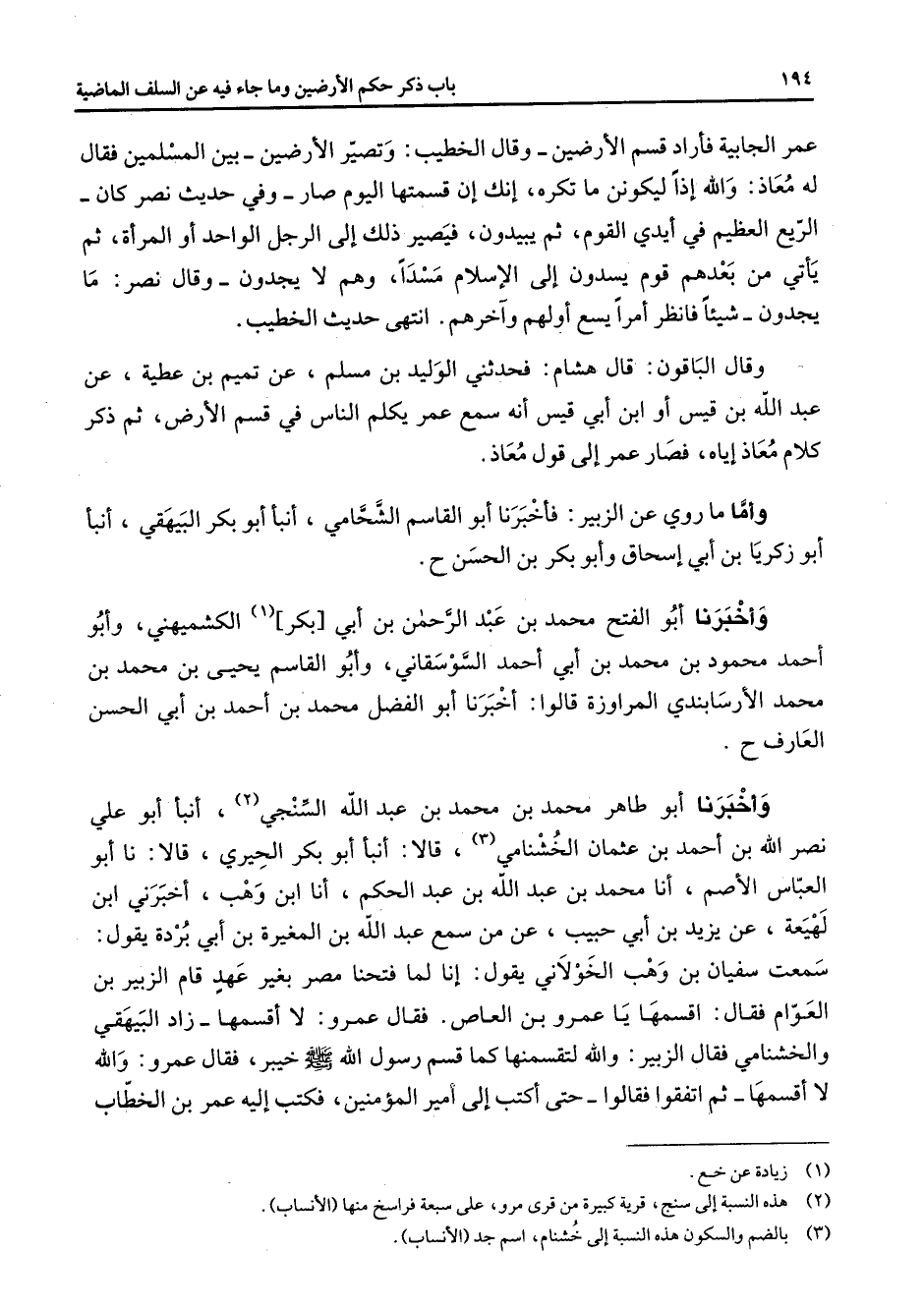 عمر الجابية فأراد قسم الأرضين وقال الخطيب وتصير الأرضين بين المسلمين فقال له معاذ والله إذا ليكونن ما تكره إنك إن قسمتها اليوم صار وفي حديث نصر كان الريع العظيم في أيدي القوم ثم يبيدون فيصير ذلك إلى الرجل الواحد أو المرأة ثم يأتي من بعدهم قوم يسدون إلى الإسلام مسدا وهم لا يجدون وقال نصر ما يجدون شيئا فانظر أمرا يسع أولهم وآخرهم انتهى حديث الخطيب وقال الباقون قال هشام فحدثني الوليد بن مسلم عن تميم بن عطية عن عبد الله بن قيس أو ابن أبي قيس أنه سمع عمر يكلم الناس في قسم الأرض ثم ذكر كلام معاذ إياه فصار عمر إلى قول معاذ وأما ما روي عن الزبير فأخبرنا أبو القاسم الشحامي أنبأ أبو بكر البيهقي أنبأ أبو زكريا بن أبي إسحاق وأبو بكر بن الحسن وأخبرنا أبو الفتح محمد بن عبد الرحمن بن أبي بكر (1) الكشميهني وابو أحمد محمود بن محمد بن أبي أحمد السوسقاني وأبو القاسم يحيى بن محمد بن محمد الأرسابندي المراوزة قالوا أخبرنا أبو الفضل محمد بن أحمد بن أبي الحسن العارف وأخبرنا أبو طاهر محمد بن محمد بن عبد الله السنجي (2) أنبأ أبو علي نصر الله بن أحمد بن عثمان الخشنامي (3) قالا أنبأ أبو بكر الحيري قالا نا أبو العباس الأصم أنا محمد بن عبد الله بن عبد الحكم أنا ابن وهب أخبرني ابن لهيعة عن يزيد بن أبي حبيب عن من سمع عبد الله بن المغيرة بن أبي بردة يقول سمعت سفيان بن وهب الخولاني يقول إنا لما فتحنا مصر بغير عهد قام الزبير بن العوام فقال اقسمها يا عمرو بن العاص فقال عمرو لا أقسمها زاد البيهقي والخشنامي فقال الزبير والله لتقسمنها كما قسم رسول الله (صلى الله عليه وسلم) خيبر فقال عمرو والله لا أقسمها ثم اتفقوا فقالوا حتى أكتب إلى أمير المؤمنين فكتب إليه عمر بن الخطاب