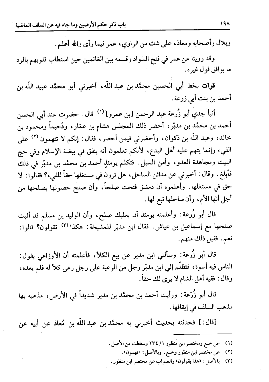 وبلال وأصحابه ومعاذ على شك من الراوي عمر فيما رأى والله أعلم وقد روينا عن عمر في فتح السواد وقسمه بين الغانمين حين استطاب قلوبهم بالرد ما يوافق قول غيره قرأت بخط أبي الحسين محمد بن عبد الله أخبرني أبو محمد عبيد الله بن أحمد بن بنت أبي زرعة أنبأ جدي أبو زرعة عبد الرحمن بن عمرو (1) قال حضرت عند أبي الحسن أحمد بن محمد بن مدبر أحضر ذلك المجلس هشام بن عمار ودحيما ومحمود بن خالد وعبد الله بن ذكوان وأحضرني فيمن أحضر فقال إنكم لا تتهمون (2) على الفئ وإنما يتهم عليه أهل البدع لأنكم تعلمون أنه ينفق في بيضة الإسلام وفي حج البيت ومجاهدة العدو وأمن السبل فتكلم يومئذ أحمد بن محمد بن مدبر في ذلك فأبلغ وقال أخبرني عن مدائن الساحل هل ترون في مستغلها حقا للفئ فقالوا لا حق في مستغلها وأعلموه أن دمشق فتحت صلحا وأن صلح حصونها بصلحها من أجل أنها الأم وأن ساحلها تبع لها قال أبو زرعة وأعلمته يومئذ أن بعلبك صلح وأن الوليد بن مسلم قد أثبت صلحها مع إسماعيل بن عياش فقال ابن مدبر للمشيخة هكذا (3) تقولون قالوا نعم فقبل ذلك منهم قال أبو زرعة وسألني ابن مدبر عن بيع الكلأ فأعلمته أن الأوزاعي يقول الناس فيه اسوة فتظلم إلي ابن مدبر رجل من الرعية على رجل رعى كلأ له فلم يعده وقال فقيه أهل الشام لا يرى لك حقا قال أبو زرعة ورأيت أحمد بن محمد بن مدبر شديدا في الأرض مذهبه بها مذهب السلف في إيقافها قال فحدثته بحديث أخبرني به محمد بن عبد الله بن معاذ عن أبيه عن
