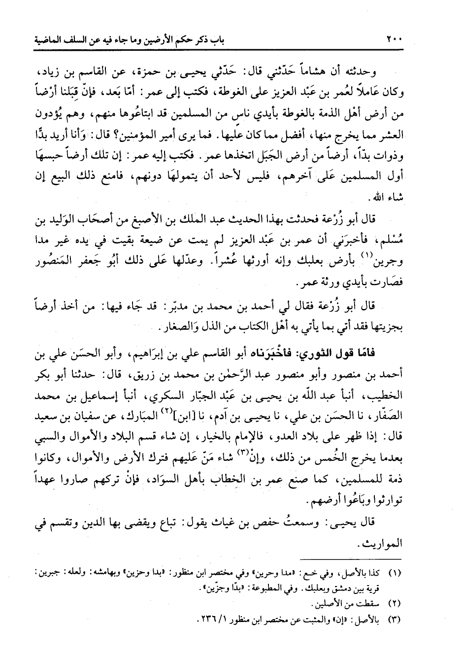 وحدثته أن هشاما حدثني قال حدثي يحيى بن حمزة عن القاسم بن زياد وكان عاملا لعمر بن عبد العزيز على الغوطة فكتب إلى عمر أما بعد فإن قبلنا أرضا من أرض أهل الذمة بالغوطة بأيدي ناس من المسلمين قد ابتاعوها منهم وهم يؤدون العشر مما يخرج منها أفضل مما كان عليها فما يرى أمير المؤمنين قال وأنا أريد بدا وذوات بدا أرضا من ارض الجبل اتخذها عمر فكتب إليه عمر إن تلك أرضا حبسها أول المسلمين على آخرهم فليس لأحد أن يتمولها دونهم فامنع ذلك البيع إن شاء الله قال أبو زرعة فحدثت بهذا الحديث عبد الملك بن الأصبغ من أصحاب الوليد بن مسلم فأخبرني أن عمر بن عبد العزيز لم يمت عن ضيعة بقيت في يده غير مدا وجرين (1) بأرض بعلبك وإنه أورثها عشرا وعدلها على ذلك أبو جعفر المنصور فصارت بأيدي ورثة عمر قال أبو زرعة فقال لي أحمد بن محمد بن مدبر قد جاء فيها من أخذ أرضا بجزيتها فقد أتي بما يأتي به أهل الكتاب من الذل والصغار فأما قول الثوري فأخبرناه أبو القاسم علي بن إبراهيم وأبو الحسن علي بن أحمد بن منصور وأبو منصور عبد الرحمن بن محمد بن زريق قال حدثنا أبو بكر الخطيب أنبأ عبد الله بن يحيى بن عبد الجبار السكري أنبأ إسماعيل بن محمد الصفار نا الحسن بن علي نا يحيى بن آدم نا ابن (2) المبارك عن سفيان بن سعيد قال إذا ظهر على بلاد العدو فالإمام بالخيار إن شاء قسم البلاد والأموال والسبي بعدما يخرج الخمس من ذلك وإن (3) شاء من عليهم فترك الأرض والأموال وكانوا ذمة للمسلمين كما صنع عمر بن الخطاب بأهل السواد فإن تركهم صاروا عهدا توارثوا وباعوا أرضهم قال يحيى وسمعت حفص بن غياث يقول تباع ويقضى بها الدين وتقسم في