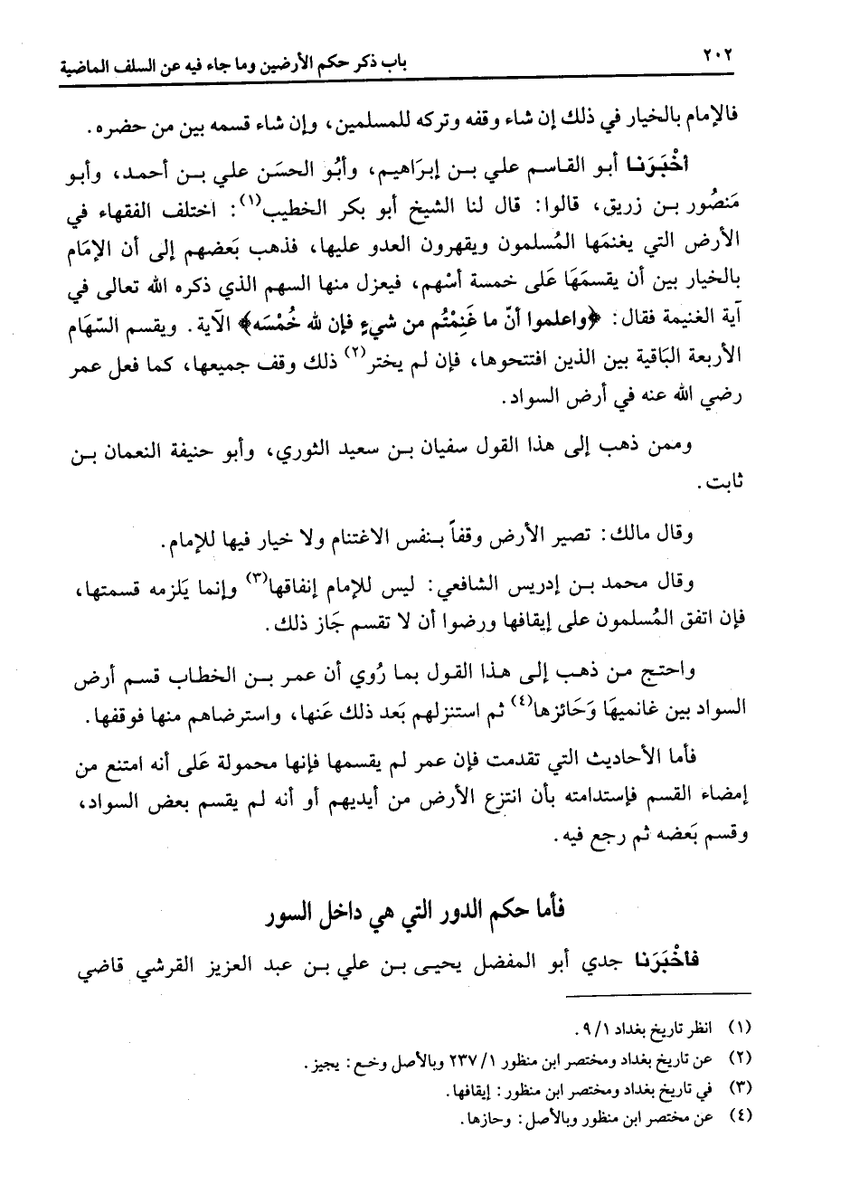 فالإمام بالخيار في ذلك إن شاء وقفه وتركه للمسلمين وإن شاء قسمه بين من حضره أخبرنا أبو القاسم علي بن إبراهيم وأبو الحسن علي بن أحمد وأبو منصور بن زريق قالوا قال لنا الشيخ أبو بكر الخطيب (1) اختلف الفقهاء في الأرض التي يغنمها المسلمون ويقهرون العدو عليها فذهب بعضهم إلى أن الإمام بالخيار بين أن يقسمها على خمسة أسهم فيعزل منها السهم الذي ذكره الله تعالى في آية الغنيمة فقال " واعلموا أن ما غنمتم من شئ فإن لله خمسه " الآية ويقسم السهام الأربعة الباقية بين الذين افتتحوها فإن لم يختر (2) ذلك وقف جميعها كما فعل عمر Bهـ في أرض السواد وممن ذهب إلى هذا القول سفيان بن سعيد الثوري وأبو حنيفة النعمان بن ثابت وقال مالك تصير الارض وقفا بنفس الاغتنام ولا خيار فيها للإمام وقال محمد بن إدريس الشافعي ليس للإمام إنفاقها (3) وإنما يلزمه قسمتها فإن اتفق المسلمون على إيقافها ورضوا أن لا تقسم جاز ذلك واحتج من ذهب إلى هذا القول بما روي أن عمر بن الخطاب قسم أرض السواد بين غانميها وحائزها (4) ثم استنزلهم بعد ذلك عنها واسترضاهم منها فوقفها فأما الأحاديث التي تقدمت فإن عمر لم يقسمها فإنها محمولة على أنه امتنع من إمضاء القسم فإستدامته بأن انتزع الأرض من أيديهم أو أنه لم يقسم بعض السواد وقسم بعضه ثم رجع فيه * فأما حكم الدور التي هي داخل السور * فأخبرنا جدي أبو المفضل يحيى بن علي بن عبد العزيز القرشي قاضي