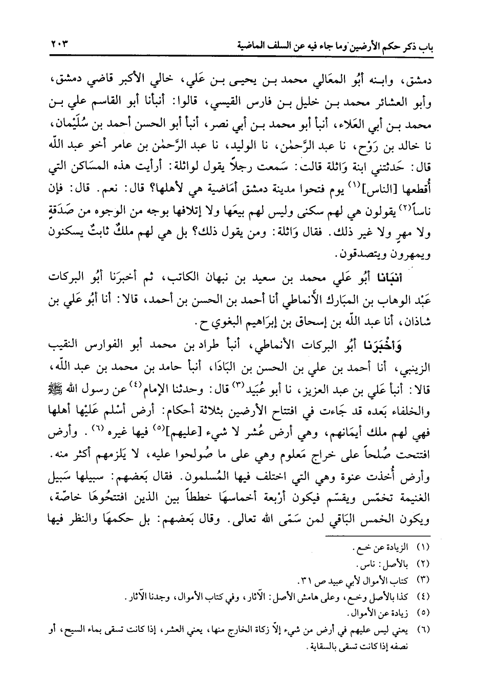 دمشق وابنه أبو المعالي محمد بن يحيى بن علي خالي الأكبر قاضي دمشق وأبو العشائر محمد بن خليل بن فارس القيسي قالوا أنبأنا أبو القاسم علي بن محمد بن أبي العلاء أنبأ أبو محمد بن أبي نصر أنبأ أبو الحسن أحمد بن سليمان نا خالد بن روح نا عبد الرحمن نا الوليد نا عبد الرحمن بن عامر أخو عبد الله قال حدثتني ابنة واثلة قالت سمعت رجلا يقول لواثلة أرأيت هذه المساكن التي أقطعها الناس (1) يوم فتحوا مدينة دمشق أماضية هي لأهلها قال نعم قال فإن ناسا (2) يقولون هي لهم سكنى وليس لهم بيعها ولا إتلافها بوجه من الوجوه من صدقة ولا مهر ولا غير ذلك فقال واثلة ومن يقول ذلك بل هي لهم ملك ثابت يسكنون ويمهرون ويتصدقون أنبأنا أبو علي محمد بن سعيد بن نبهان الكاتب ثم أخبرنا أبو البركات عبد الوهاب بن المبارك الأنماطي أنا أحمد بن الحسن بن أحمد قالا أنا أبو علي بن شاذان أنا عبد الله بن إسحاق بن إبراهيم البغوي وأخبرنا أبو البركات الأنماطي أنبأ طراد بن محمد أبو الفوارس النقيب الزينبي أنا أحمد بن علي بن الحسن بن البادا أنبأ حامد بن محمد بن عبد الله قالا أنبأ علي بن عبد العزيز نا أبو عبيد (3) قال وحدثنا الإمام (4) عن رسول الله (صلى الله عليه وسلم) والخلفاء بعده قد جاءت في افتتاح الأرضين بثلاثة أحكام أرض أسلم عليها أهلها فهي لهم ملك أيمانهم وهي أرض عشر لا شئ عليهم (5) فيها غيره (6) وأرض افتتحت صلحا على خراج معلوم وهي على ما صولحوا عليه لا يلزمهم أكثر منه وأرض أخذت عنوة وهي التي اختلف فيها المسلمون فقال بعضهم سبيلها سبيل الغنيمة تخمس ويقسم فيكون اربعة أخماسها خططا بين الذين افتتحوها خاصة ويكون الخمس الباقي لمن سمى الله تعالى وقال بعضهم بل حكمها والنظر فيها