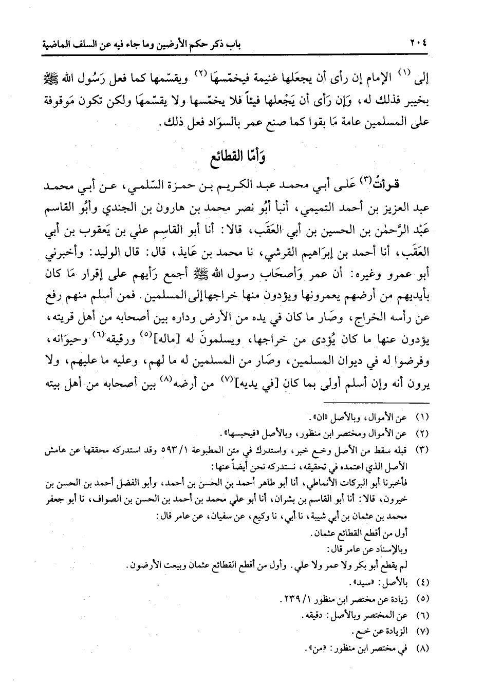 إلى (1) الإمام إن رأى أن يجعلها غنيمة فيخمسها (2) ويقسمها كما فعل رسول الله (صلى الله عليه وسلم) بخيبر فذلك له وإن رأى أن يجعلها فيئا فلا يخمسها ولا يقسمها ولكن تكون موقوفة على المسلمين عامة ما بقوا كما صنع عمر بالسواد فعل ذلك * وأما القطائع * قرأت (3) على أبي محمد عبد الكريم بن حمزة السلمي عن أبي محمد عبد العزيز بن أحمد التميمي أنبأ أبو نصر محمد بن هارون بن الجندي وأبو القاسم عبد الرحمن بن الحسين بن أبي العقب قالا أنا أبو القاسم علي بن يعقوب بن أبي العقب أنا أحمد بن إبراهيم القرشي نا محمد بن عايذ قال قال الوليد وأخبرني أبو عمرو وغيره أن عمر وأصحاب رسول الله (صلى الله عليه وسلم) أجمع رأيهم على إقرار ما كان بأيديهم من أرضهم يعمرونها ويؤدون منها خراجها إلى المسلمين فمن اسلم منهم رفع عن رأسه الخراج وصار ما كان في يده من الأرض وداره بين أصحابه من أهل قريته يؤدون عنها ما كان يؤدى من خراجها ويسلمون له ماله (5) ورقيقه (6) وحيوانه وفرضوا له في ديوان المسلمين وصار من المسلمين له ما لهم وعليه ما عليهم ولا يرون أنه وإن أسلم أولى بما كان في يديه (7) من أرضه (8) بين أصحابه من أهل بيته