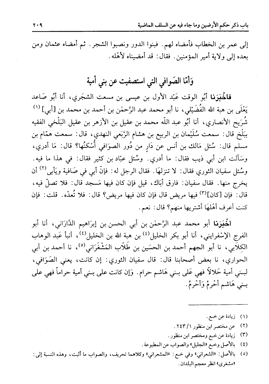 إلى عمر بن الخطاب فأمضاه لهم فبنوا الدور ونصبوا الشجر ثم أمضاه عثمان ومن بعده إلى ولاية أمير المؤمنين فقال قد أمضيناه لأهله * وأما الصوافي التي استصفيت عن بني أمية * فأخبرنا أبو الوقت عبد الأول بن عيسى بن مسعت الشجري أنا أبو صاعد يعلى بن هبة الله الفضيلي نا أبو محمد عبد الرحمن بن أحمد بن محمد بن أبي (1) شريح الأنصاري أنا أبو عبد الله محمد بن عقيل بن الأزهر بن عقيل البلخي الفقيه ببلخ قال سمعت سليمان بن الربيع بن هشام الربعي النهدي قال سمعت همام بن مسلم قال سئل مالك بن أنس عن دار من دور الصوافي أسكنها قال ما أدري وسألت ابن أبي ذيب فقال ما أدري وسئل عباد بن كثير فقال في هذا ما فيه وسئل سفيان الثوري فقال لا تنزلها فقال الرجل له فإن أبي في صافية ويأبى (2) أن يخرج منها فقال سفيان فارق أباك قيل فإن كان فيها مسجد قال فلا تصل فيه قال فإن كان فيها مريض قال فإن كان (3) فيها مريض قال فلا تعده قلت فإن كنت أعرف أهلها أشتريها منهم قال نعم أخبرنا أبو محمد عبد الرحمن بن أبي الحسن بن إبراهيم الداراني أنا أبو الفرج الإسفرايني أنا أبو بكر الخليل (4) بن هبة الله بن الخليل (4) أنبأ عبد الوهاب الكلابي نا أبو الجهم أحمد بن الحسين بن طلاب المشغراني (5) نا أحمد بن أبي الحواري نا بعض أصحابنا قال قال سفيان الثوري إن كانت يعني الصوافي لبني أمية حلالا فهي على بني هاشم حرام وإن كانت على بني أمية حراما فهي على بني هاشم أحرم وأحرم