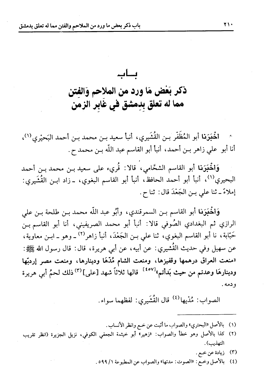 " باب ذكر بعض ما ورد من الملاحم والفتن مما له تعلق بدمشق في غابر الزمن " أخبرنا أبو المظفر بن القشيري أنبأ سعيد بن محمد بن أحمد البحيري (1) أنا أبو علي زاهر بن أحمد أنبأ أبو القاسم عبد الله بن محمد وأخبرنا أبو القاسم الشحامي قالا قرئ على سعيد بن محمد بن أحمد البحيري (1) أنبأ أبو أحمد الحافظ أنبأ أبو القاسم البغوي زاد ابن القشيري إملاء ثنا علي بن الجعد قال ثنا وأخبرنا أبو القاسم بن السمرقندي وأبو عبد الله محمد بن طلحة بن علي الرازي ثم البغدادي الصوفي قالا أنبأ أبو محمد الصريفيني أنا أبو القاسم بن حبابة نا أبو القاسم البغوي ثنا علي بن الجعد أنبأ زاهر (2) وهو ابن معاوية عن سهيل وفي حديث القشيري عن أبيه عن أبي هريرة قال قال رسول الله (صلى الله عليه وسلم) منعت العراق درهمها وقفيزها ومنعت الشام مدها ودينارها ومنعت مصر إردبها ودينارها وعدتم من حيث بدأتم