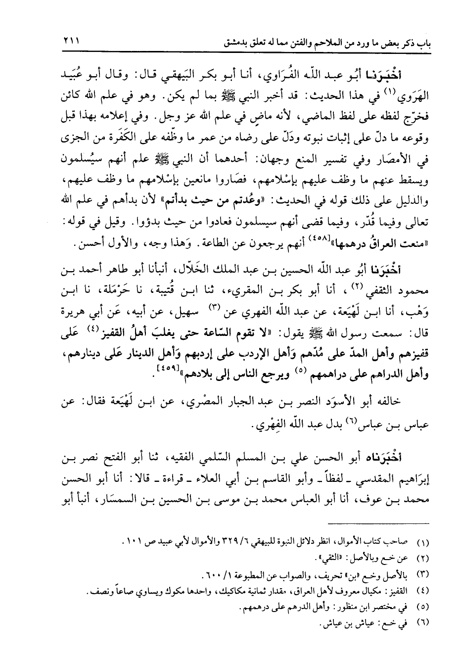 أخبرنا أبو عبد الله الفراوي أنا أبو بكر البيهقي قال وقال أبو عبيد الهروي (1) في هذا الحديث قد أخبر النبي (صلى الله عليه وسلم) بما لم يكن وهو في علم الله كائن فخرج لفظه على لفظ الماضي لأنه ماض في علم الله عز وجل وفي إعلامه بهذا قبل وقوعه ما دل على إثبات نبوته ودل على رضاه من عمر ما وظفه على الكفرة من الجزي في الأمصار وفي تفسير المنع وجهان أحدهما أن النبي (صلى الله عليه وسلم) علم أنهم سيسلمون ويسقط عنهم ما وظف عليهم بإسلامهم فصاروا مانعين بإسلامهم ما وظف عليهم والدليل على ذلك قوله في الحديث وعدتم من حيث بدأتم لأن بدأهم في علم الله تعالى وفيما قدر وفيما قضى أنهم سيسلمون فعادوا من حيث بدؤوا وقيل في قوله منعت العراق درهمها