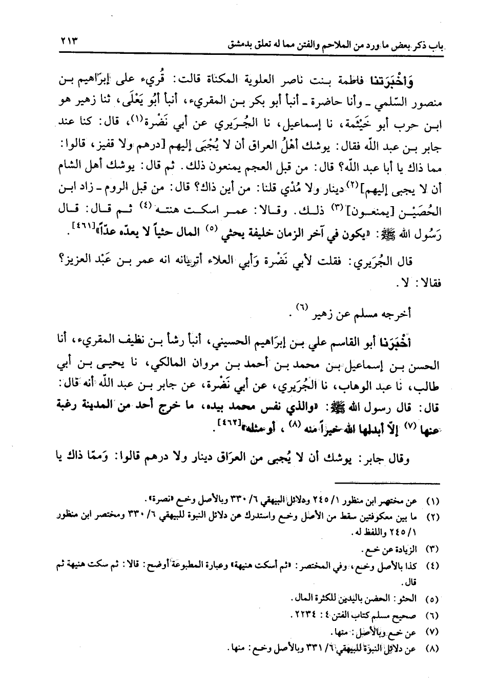 وأخبرتنا فاطمة بنت ناصر العلوية المكناة قالت قرئ على إبراهيم بن منصور السلمي وأنا حاضرة أنبأ أبو بكر بن المقرئ أنبأ أبو يعلى ثنا زهير هو ابن حرب أبو خيثمة نا إسماعيل نا الجريري عن أبي نضرة (1) قال كنا عند جابر بن عبد الله فقال يوشك أهل العراق أن لا يجبى إليهم درهم ولا قفيز قالوا مما ذاك يا أبا عبد الله قال من قبل العجم يمنعون ذلك ثم قال يوشك أهل الشام أن لا يجبى إليهم (2) دينار ولا مدي قلنا من أين ذاك قال من قبل الروم زاد ابن الحصين يمنعون (3) ذلك وقالا عمر اسكت هنته (4) ثم قال قال رسول الله (صلى الله عليه وسلم) يكون في آخر الزمان خليفة يحثي (5) المال حثيا لا يعده عدا