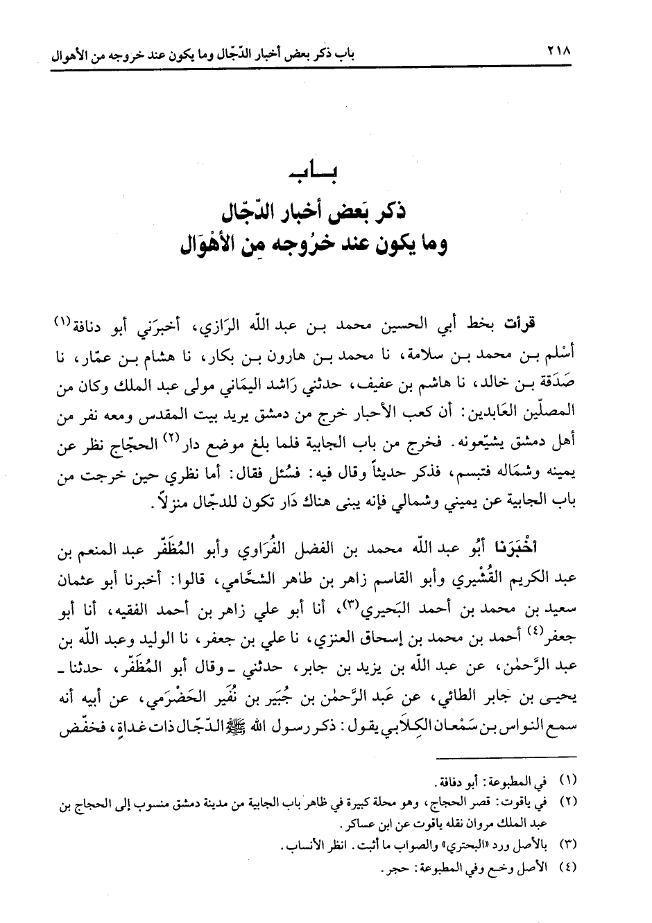 " باب ذكر بعض أخبار الدجال وما يكون عند خروجه من الأهوال " قرأت بخط أبي الحسين محمد بن عبد الله الرازي أخبرني أبو دنافة (1) أسلم بن محمد بن سلامة نا محمد بن هارون بن بكار نا هشام بن عمار نا صدقة بن خالد نا هاشم بن عفيف حدثني راشد اليماني مولى عبد الملك وكان من المصلين العابدين أن كعب الأحبار خرج من دمشق يريد بيت المقدس ومعه نفر من أهل دمشق يشيعونه فخرج من باب الجابية فلما بلغ موضع دار (2) الحجاج نظر عن يمينه وشماله فتبسم فذكر حديثا وقال فيه فسئل فقال أما نظري حين خرجت من باب الجابية عن يميني وشمالي فإنه يبنى هناك دار تكون للدجال منزلا أخبرنا أبو عبد الله محمد بن الفضل الفراوي وأبو المظفر عبد المنعم بن عبد الكريم القشيري وأبو القاسم زاهر بن طاهر الشحامي قالوا أخبرنا أبو عثمان سعيد بن محمد بن أحمد البحيري (3) أنا أبو علي زاهر بن أحمد الفقيه أنا أبو جعفر (4) أحمد بن محمد بن إسحاق العنزي نا علي بن جعفر نا الوليد وعبد الله بن عبد الرحمن عن عبد الله بن يزيد بن جابر حدثني وقال أبو المظفر حدثنا يحيى بن جابر الطائي عن عبد الرحمن بن جبير بن نفير الحضرمي عن أبيه أنه سمع النواس بن سمعان الكلابي يقول ذكر رسول الله (صلى الله عليه وسلم) الدجال ذات غداة فخفض