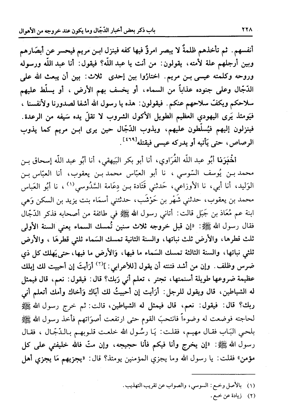 [469] أخبرنا أبو عبد الله الفراوي أنا أبو بكر البيهقي أنا أبو عبد الله إسحاق بن محمد بن يوسف السوسي نا أبو العباس محمد بن يعقوب أنا العباس بن الوليد أنا أبي نا الأوزاعي حدثني قتادة بن دعامة السدوسي (1) نا أبو العباس محمد بن يعقوب حدثني شهر بن حوشب حدثتني أسماء بنت يزيد بن السكن وهي ابنة عم معاذ بن جبل قالت أتاني رسول الله (صلى الله عليه وسلم) في طائفة من أصحابه فذكر الدجال فقال رسول الله (صلى الله عليه وسلم) إن قبل خروجه ثلاث سنين تمسك السماء يعني السنة الأولى ثلث قطرها والأرض ثلث نباتها والسنة الثانية تمسك السماء ثلثي قطرها والأرض ثلثي نباتها والسنة الثالثة تمسك السماء ما فيها والأرض ما فيها حتى يهلك كل ذي ضرس وظلف وإن من أشد فتنته أن يقول للأعرابي (2) أرأيت إن أحييت لك إبلك عظيمة ضروعها طويلة أسنمتها تجتر تعلم أني ربك قال فيقول نعم قال فيمثل له الشياطين قال ويقول للرجل أرأيت إن أحييت لك أباك وأخاك وأمك أتعلم أني ربك قال فيقول نعم قال فيمثل له الشياطين قالت ثم خرج رسول الله (صلى الله عليه وسلم) لحاجته فوضعت له وضوءا فانتحب القوم حتى ارتفعت أصواتهم فأخذ رسول الله (صلى الله عليه وسلم) بلحي الباب فقال مهيم فقلت يا رسول الله خلعت قلوبهم بالدجال فقال رسول الله (صلى الله عليه وسلم) إن يخرج وأنا فيكم فأنا حجيجه وإن مت فالله خليفتي على كل مؤمن فقلت يا رسول الله وما يجزي المؤمنين يومئذ قال يجزيهم ما يجزي أهل