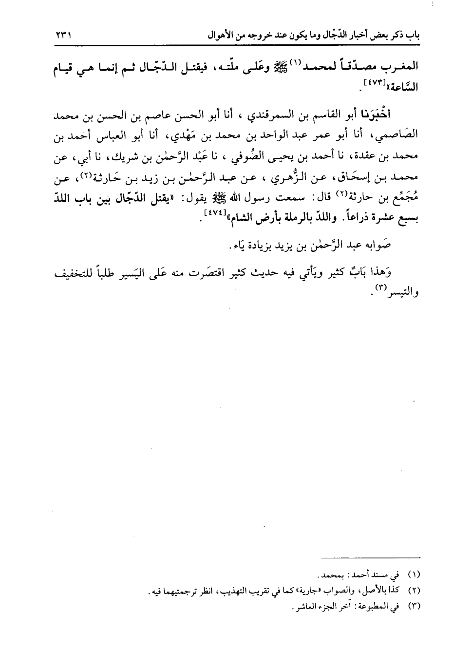 [473] أخبرنا أبو القاسم بن السمرقندي أنا أبو الحسن عاصم بن الحسن بن محمد الصاصمي أنا أبو عمر عبد الواحد بن محمد بن مهدي أنا أبو العباس أحمد بن محمد بن عقدة نا أحمد بن يحيى الصوفي نا عبد الرحمن بن شريك نا أبي عن محمد بن إسحاق عن الزهري عن عبد الرحمن بن زيد بن حارثة (2) عن مجمع بن حارثة (2) قال سمعت رسول الله (صلى الله عليه وسلم) يقول يقتل الدجال بين باب اللد بسبع عشرة ذراعا واللد بالرملة بأرض الشام