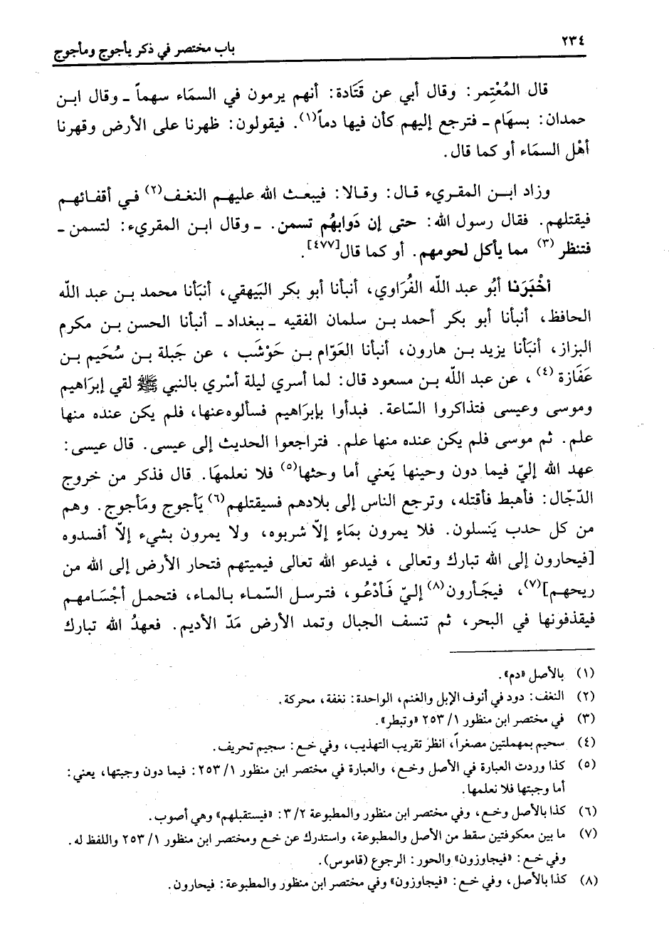 [477] أخبرنا أبو عبد الله الفراوي أنبأنا أبو بكر البيهقي أنبأنا محمد بن عبد الله الحافظ أنبأنا أبو بكر أحمد بن سلمان الفقيه ببغداد أنبأنا الحسن بن مكرم البزاز أنبأنا يزيد بن هارون أنبأنا العوام بن حوشب عن جبلة بن سحيم بن عفازة (4) عن عبد الله بن مسعود قال لما أسري ليلة أسري بالنبي (صلى الله عليه وسلم) لقي إبراهيم وموسى وعيسى فتذاكروا الساعة فبدأوا بإبراهيم فسألوه عنها فلم يكن عنده منها علم ثم موسى فلم يكن عنده منها علم فتراجعوا الحديث إلى عيسى قال عيسى عهد الله إلي فيما دون وحينها يعني أما وحثها (5) فلا نعلمها قال فذكر من خروج الدجال فأهبط فأقتله وترجع الناس إلى بلادهم فسيقتلهم (6) يأجوج ومأجوج وهم من كل حدب ينسلون فلا يمرون بماء إلا شربوه ولا يمرون بشئ إلا أفسدوه فيحارون إلى الله تبارك وتعالى فيدعو الله تعالى فيميتهم فتحار الأرض إلى الله من ريحهم (7) فيجأرون (8) إلي فأدعو فترسل السماء بالماء فتحمل أجسامهم فيقذفونها في البحر ثم تنسف الجبال وتمد الأرض مد الأديم فعهد الله تبارك