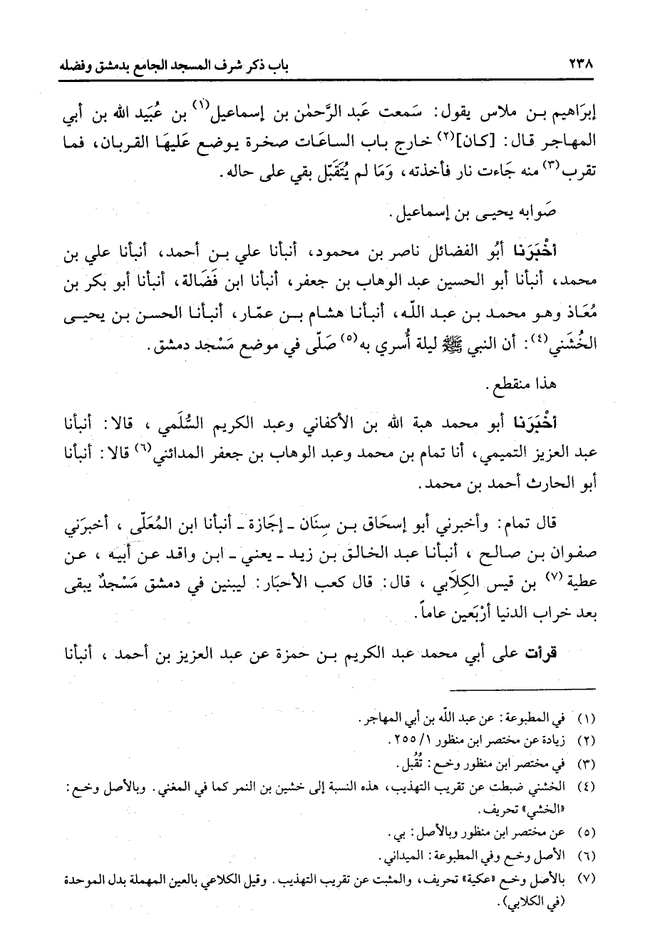 إبراهيم بن ملاس يقول سمعت عبد الرحمن بن إسماعيل (1) بن عبيد الله بن أبي المهاجر قال كان (2) خارج باب الساعات صخرة يوضع عليها القربان فما تقرب (3) منه جاءت نار فأخذته وما لم يتقبل بقي على حاله صوابه يحيى بن إسماعيل أخبرنا أبو الفضائل ناصر بن محمود أنبأنا علي بن أحمد أنبأنا علي بن محمد أنبأنا أبو الحسين عبد الوهاب بن جعفر أنبأنا ابن فضالة أنبأنا أبو بكر بن معاذ وهو محمد بن عبد الله أنبأنا هشام بن عمار أنبأنا الحسن بن يحيى الخشني (4) أن النبي (صلى الله عليه وسلم) ليلة أسري به (5) صلى في موضع مسجد دمشق هذا منقطع أخبرنا أبو محمد هبة الله بن الأكفاني وعبد الكريم السلمي قالا أنبأنا عبد العزيز التميمي أنا تمام بن محمد وعبد الوهاب بن جعفر المدائني (6) قالا أنبأنا أبو الحارث أحمد بن محمد قال تمام وأخبرني أبو إسحاق بن سنان إجازة أنبأنا ابن المعلى أخبرني صفوان بن صالح أنبأنا عبد الخالق بن زيد يعني ابن واقد عن أبيه عن عطية (7) بن قيس الكلابي قال قال كعب الأحبار ليبنين في دمشق مسجد يبقى بعد خراب الدنيا أربعين عاما قرأت على أبي محمد عبد الكريم بن حمزة عن عبد العزيز بن أحمد أنبأنا