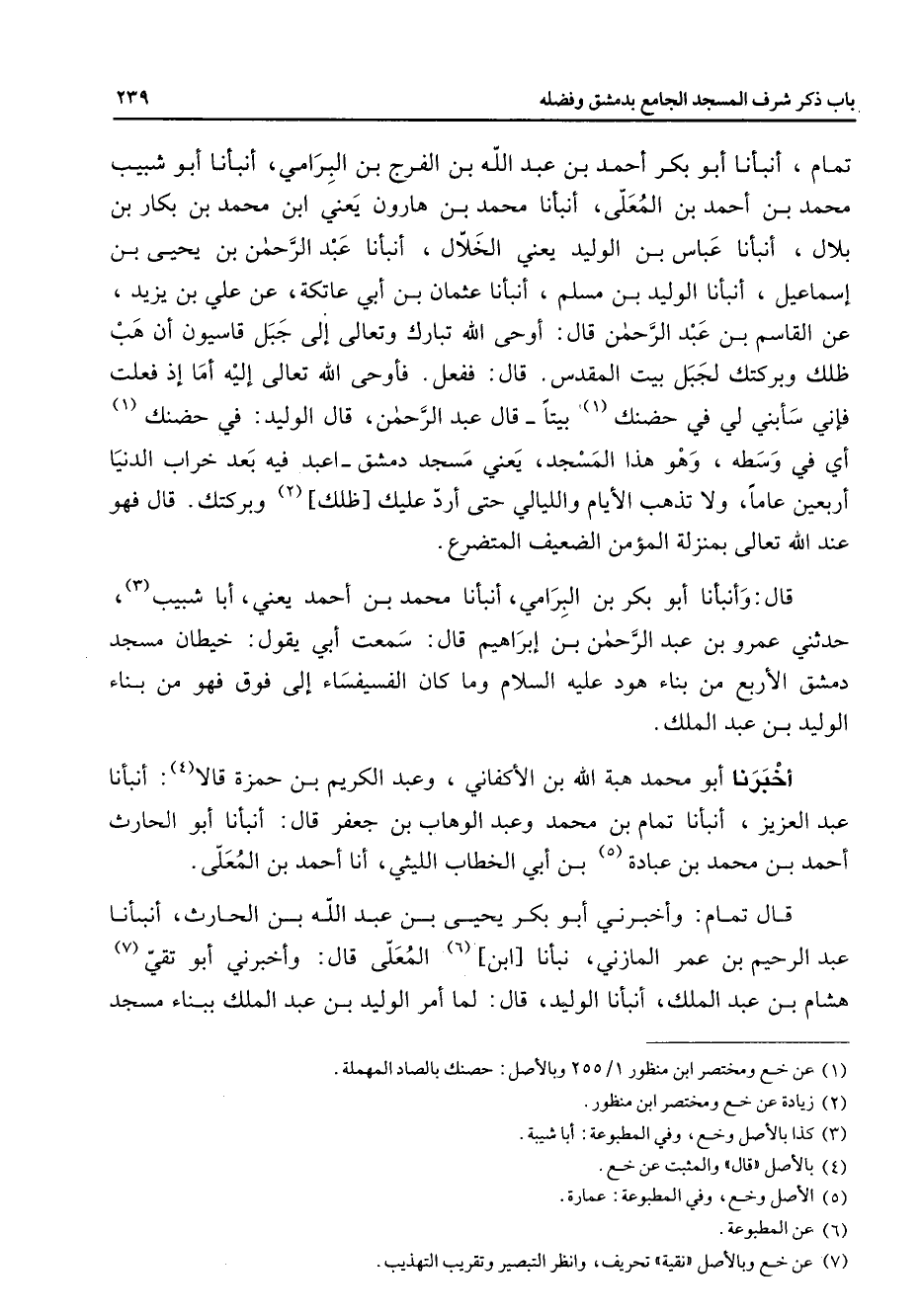 تمام أنبأنا أبو بكر أحمد بن عبد الله بن الفرج بن البرامي أنبأنا أبو شبيب محمد بنبن أحمد بن المعلى أنبأنا محمد بن هارون يعني ابن محمد بن بكار بن بلال أنبأنا عباس بن الوليد يعني الخلال أنبأنا عبد الرحمن بن يحيى بن إسماعيل أنبأنا الوليد بن مسلم أنبأنا عثمان بن أبي عاتكة عن علي بن يزيد عن القاسم بن عبد الرحمن قال أوحى الله تبارك وتعالى إلى جبل قاسيون أن هب ظلك وبركتك لجبل بيت المقدس قال ففعل فأوحى الله تعالى إليه أما إذ فعلت فإني سأبني لي في حضنك (1) بيتا قال عبد الرحمن قال الوليد في حضنك (1) أي في وسطه وهو هذا المسجد يعني مسجد دمشق اعبد فيه بعد خراب الدنيا أربعين عاما ولا تذهب الأيام والليالي حتى أرد عليك ظلك (2) وبركتك قال فهو عند الله تعالى بمنزلة المؤمن الضعيف المتضرع قال وأنبأنا أبو بكر بن البرامي أنبأنا محمد بن أحمد يعني أبا شبيب (3) حدثني عمرو بن عبد الرحمن بن إبراهيم قال سمعت أبي يقول خيطان مسجد دمشق الأربع من بناء هود عليه السلام وما كان الفسيفساء إلى فوق فهو من بناء الوليد بن عبد الملك أخبرنا أبو محمد هبة الله بن الأكفاني وعبد الكريم بن حمزة قالا (4) أنبأنا عبد العزيز أنبأنا تمام بن محمد وعبد الوهاب بن جعفر قال أنبأنا أبو الحارث أحمد بن محمد بن عبادة (5) بن أبي الخطاب الليثي أنا أحمد بن المعلى قال تمام وأخبرني أبو بكر يحيى بن عبد الله بن الحارث أنبأنا عبد الرحيم بن عمر المازني نبأنا ابن (6) المعلى قال وأخبرني أبو تقي (7) هشام بن عبد الملك أنبأنا الوليد قال لما أمر الوليد بن عبد الملك ببناء مسجد