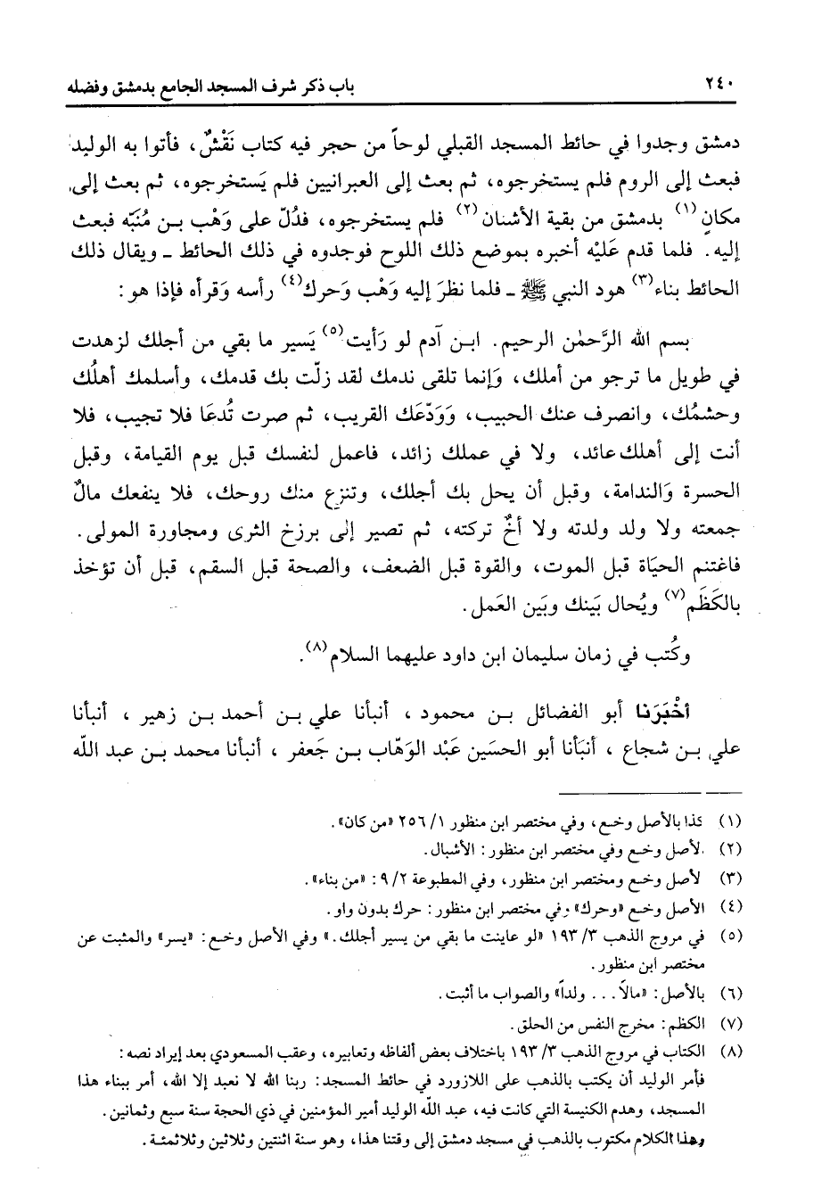 دمشق وجدوا في حائط المسجد القبلي لوحا من حجر فيه كتاب نقش فأتوا به الوليد فبعث إلى الروم فلم يستخرجوه ثم بعث إلى العبرانيين فلم يستخرجوه ثم بعث إلى مكان (1) بدمشق من بقية الأشنان (2) فلم يستخرجوه فدل على وهب بن منبه فبعث إليه فلما قدم عليه أخبره بموضع ذلك اللوح فوجدوه في ذلك الحائط ويقال ذلك الحائط بناء (3) هود النبي (صلى الله عليه وسلم) فلما نظر إليه وهب وحرك (4) رأسه وقرأه فإذا هو بسم الله الرحمن الرحيم ابن آدم لو رأيت (5) يسير ما بقي من أجلك لزهدت في طويل ما ترجو من أملك وإنما تلقى ندمك لقد زلت بك قدمك وأسلمك أهلك وحشمك وانصرف عنك الحبيب وودعك القريب ثم صرت تدعا فلا تجيب فلا أنت إلى أهلك عائد ولا في عملك زائد فاعمل لنفسك قبل يوم القيامة وقبل الحسرة والندامة وقبل أن يحل بك أجلك وتنزع منك روحك فلا ينفعك مال جمعته ولا ولد ولدته ولا أخ تركته ثم تصير إلى برزخ الثرى ومجاورة المولى فاغتنم الحياة قبل الموت والقوة قبل الضعف والصحة قبل السقم قبل أن تؤخذ بالكظم (7) ويحال بينك وبين العمل وكتب في زمان سليمان ابن داود عليهما السلام (8) أخبرنا أبو الفضائل بن محمود أنبأنا علي بن أحمد بن زهير أنبأنا علي بن شجاع أنبأنا أبو الحسين عبد الوهاب بن جعفر أنبأنا محمد بن عبد الله