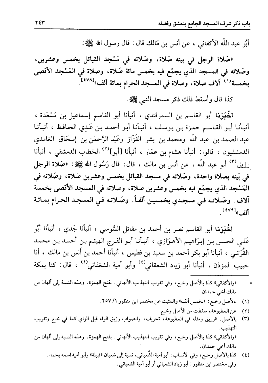 [478] كذا قال وأسقط ذلك ذكر مسجد النبي (صلى الله عليه وسلم) أخبرنا أبو القاسم بن السمرقندي أنبأنا أبو القاسم إسماعيل بن مسعدة أنبأنا أبو القاسم حمزة بن يوسف أنبأنا أبو أحمد بن عدي الحافظ أنبأنا عبد الصمد بن عبد الله ومحمد بن بشر القزاز وعبد الرحمن بن إسحاق الغامدي الدمشقيون قالوا أنبأنا هشام بن عمار أنبأنا أبو (2) الخطاب الدمشقي أنبأنا رزيق (3) أبو عبد الله عن أنس بن مالك قال قال رسول الله (صلى الله عليه وسلم) صلاة الرجل في بيته بصلاة واحدة وصلاته في مسجد القبائل بخمس وعشرين صلاة وصلاته في المسجد الذي يجمع فيه بخمس وعشرين صلاة وصلاته في المسجد الأقصى بخمسة آلاف وصلاته في مسجدي بخمسين ألفا وصلاته في المسجد الحرام بمائة ألف