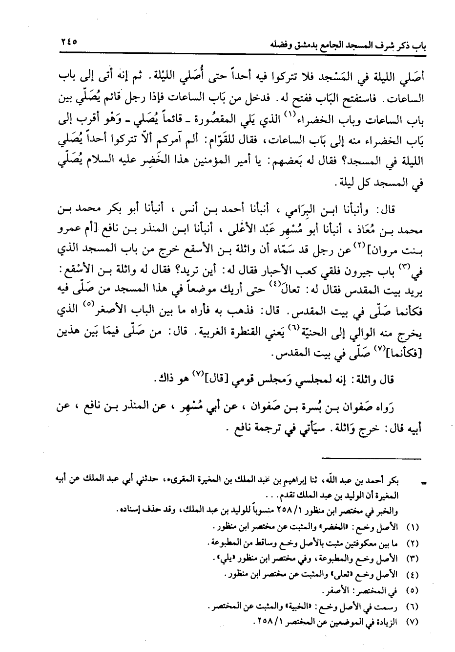 أصلي الليلة في المسجد فلا تتركوا فيه أحدا حتى أصلي الليلة ثم إنه أتى إلى باب الساعات فاستفتح الباب ففتح له فدخل من باب الساعات فإذا رجل قائم يصلي بين باب الساعات وباب الخضراء (1) الذي يلي المقصورة قائما يصلي وهو أقرب إلى باب الخضراء منه إلى باب الساعات فقال للقوام ألم آمركم ألا تتركوا أحدا يصلي الليلة في المسجد فقال له بعضهم يا أمير المؤمنين هذا الخضر عليه السلام يصلي في المسجد كل ليلة قال وأنبأنا ابن البرامي أنبأنا أحمد بن أنس أنبأنا أبو بكر محمد بن محمد بن معاذ أنبأنا أبو مسهر عبد الأعلى أنبأنا ابن المنذر بن نافع أم عمرو بنت مروان (2) عن رجل قد سماه أن واثلة بن الأسقع خرج من باب المسجد الذي في (3) باب جيرون فلقي كعب الأحبار فقال له اين تريد فقال له واثلة بن الأسقع يريد بيت المقدس فقال له تعال (4) حتى أريك موضعا في هذا المسجد من صلى فيه فكأنما صلى في بيت المقدس قال فذهب به فأراه ما بين الباب الأصغر (5) الذي يخرج منه الوالي إلى الحنية (6) يعني القنطرة الغربية قال من صلى فيما بين هذين فكأنما (7) صلى في بيت المقدس قال واثلة إنه لمجلسي ومجلس قومي قال (7) هو ذاك رواه صفوان بن بسرة بن صفوان عن أبي مسهر عن المنذر بن نافع عن أبيه قال خرج واثلة سيأتي في ترجمة نافع