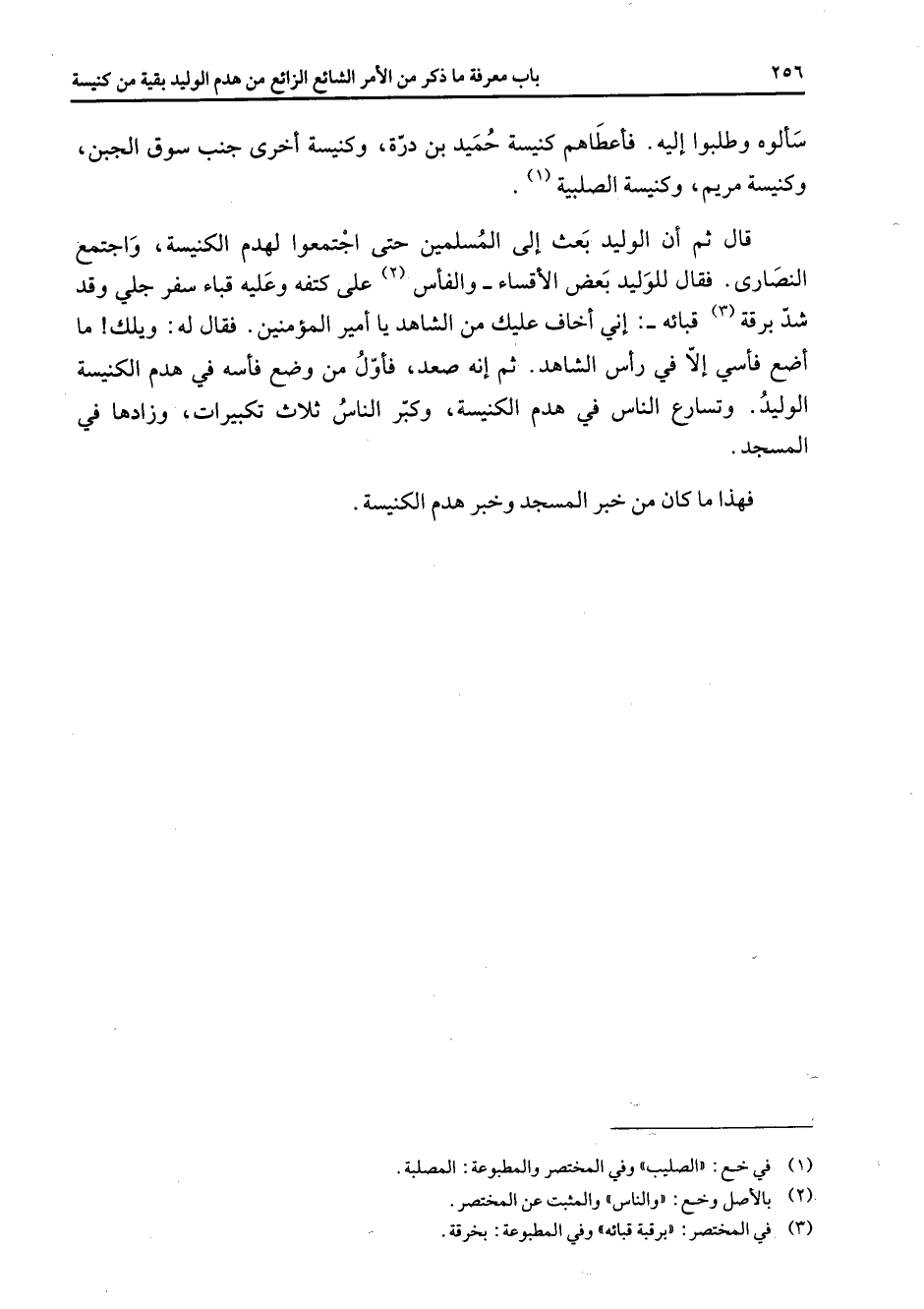 سألوه وطلبوا إليه فأعطاهم كنيسة حميد بن درة وكنيسة أخرى جنب سوق الجبن وكنيسة وكنيسة مريم وكنيسة الصلبية (1) قال ثم أن الوليد بعث إلى المسلمين حتى اجتمعوا لهدم الكنيسة واجتمع النصارى فقال للوليد بعض الأقساء والفأس (2) على كتفه وعليه قباء سفرجلي وقد شد برقة (3) قبائه إني أخاف عليك من الشاهد يا أمير المؤمنين فقال له ويلك ما أضع فأسي إلا في رأس الشاهد ثم إنه صعد فأول من وضع فأسه في هدم الكنيسة الوليد وتسارع الناس في هدم الكنيسة وكبر الناس ثلاث تكبيرات وزادها في المسجد فهذا ما كان من خبر المسجد وخبر هدم الكنيسة
