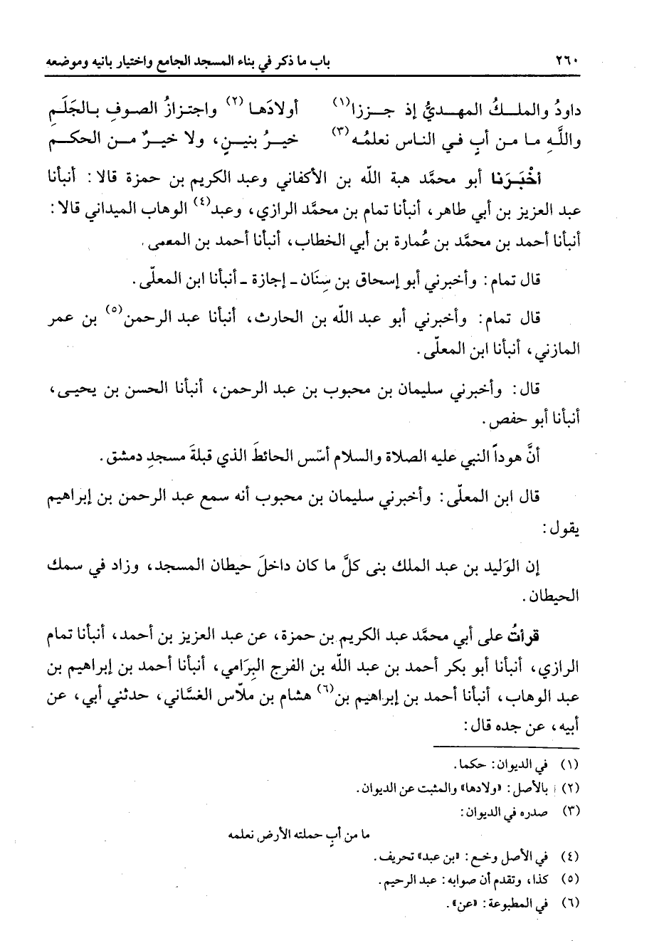 داود والملك المهدي إذ جززا (1) * أولادها (2) واجتزاز الصوف بالجلم والله ما من أب في الناس نعلمه (3) * خير بنين ولا خير من الحكم أخبرنا أبو محمد هبة الله بن الأكفاني وعبد الكريم بن حمزة قالا أنبأنا عبد العزيز بن أبي طاهر أنبأنا تمام بن محمد الرازي وعبد (4) الوهاب الميداني قالا أنبأنا أحمد بن محمد بن عمارة بن أبي الخطاب أنبأنا أحمد بن المعلى قال تمام وأخبرني أبو إسحاق بن سنان إجازة أنبأنا ابن المعلى قال تمام وأخبرني أبو عبد الله بن الحارث أنبأنا عبد الرحمن (5) بن عمر المازني أنبأنا ابن المعلى قال وأخبرني سليمان بن محبوب بن عبد الرحمن أنبأنا الحسن بن يحيى أنبأنا أبو حفص أن هودا النبي عليه الصلاة والسلام أسس الحائط الذي قبلة مسجد دمشق قال ابن المعلى وأخبرني سليمان بن محبوب أنه سمع عبد الرحمن بن إبراهيم يقول إن الوليد بن عبد الملك بنى كل ما كان داخل حيطان المسجد وزاد في سمك الحيطان قرأت على أبي محمد عبد الكريم بن حمزة عن عبد العزيز بن أحمد أنبأنا تمام الرازي أنبأنا أبو بكر أحمد بن عبد الله بن الفرج البرامي أنبأنا أحمد بن إبراهيم بن عبد الوهاب أنبأنا أحمد بن إبراهيم بن (6) هشام بن ملاس الغساني حدثني أبي عن أبيه عن جده قال