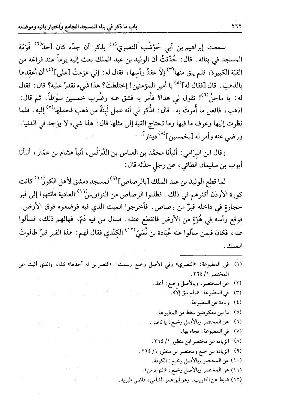 سمعت إبراهيم بن أبي حوشب النصري (1) يذكر أن جده كان أحد (2) قومة المسجد في بنائه قال حدثت أن الوليد بن عبد الملك بعث إليه يوما عند فراغه من القبة الكبيرة فلم يبق منها (3) إلا عقد رأسها فقال له إني عزمت على (4) أن أعقدها بالذهب قال فقال له (5) يا أمير المؤمنين إختلطت هذا شئ نقدر عليه قال فقال له يا ماجن (6) تقول لي هذا فأمر به فشق عنه وضرب خمسين سوطا ثم قال اذهب فافعل ما أمرت به قال فذكر لي أنه عمل لبنة من ذهب فحملها (7) إليه فلما نظرت إليها وعرف ما فيها وما تحتاج القبة إلى مثلها قال هذا شئ لا يوجد في الدنيا ورضي عنه وأمر له بخمسين (8) دينارا وقال ابن البرامي أنبأنا محمد بن العباس بن الدرفس أنبأ هشام بن عمار أنبأنا أيوب بن سليمان الطائي عن رجل حدثه قال لما قطع الوليد بن عبد الملك بالرصاص (9) لمسجد دمشق لأهل الكور (10) كانت كورة الأردن أكثرهم في ذلك فطلبوا الرصاص من النواويس (11) العادية فانتهوا إلى قبر حجارة في داخله قبر من رصاص فأخرجوا الميت الذي فيه فوضعوه فوق الأرض فوقع رأسه في هوة من الأرض فانقطع عنقه فسال من فيه دم فهالهم ذلك فسألوا عنه فكان فيمن سألوا عنه عبادة بن نسي (12) الكندي فقال لهم هذا القبر قبر طالوت الملك