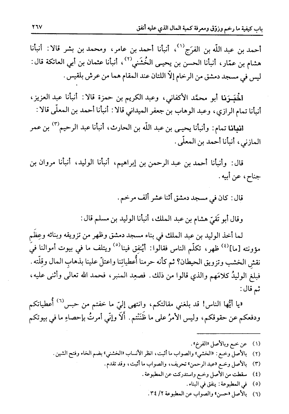 أحمد بن عبد الله بن الفرج (1) أنبأنا أحمد بن عامر ومحمد بن بشر قالا أنبأنا هشام بن عمار أنبأنا الحسن بن يحيى الخشني (2) أنبأنا عثمان بن أبي العاتكة قال ليس في مسجد دمشق من الرخام إلا اللتان عند المقام هما من عرش بلقيس أخبرنا أبو محمد الأكفاني وعبد الكريم بن حمزة قالا أنبأنا عبد العزيز أنبأنا تمام الرازي وعبد الوهاب بن جعفر الميداني قالا أنبأنا أحمد بن المعلى قالا أنبأنا تمام وأنبأنا يحيى بن عبد الله بن الحارث أنبأنا عبد الرحيم (3) بن عمر المازني أنبأنا أحمد بن المعلى قال وأنبأنا أحمد بن عبد الرحمن بن إبراهيم أنبأنا الوليد أنبأنا مروان بن جناح عن أبيه قال كان في مسجد دمشق اثنا عشر ألف مرخم وقال أبو تقي هشام بن عبد الملك أنبأنا الوليد بن مسلم قال لما أخذ الوليد بن عبد الملك في بناء مسجد دمشق وظهر من تزويقه وبنائه وعظم مؤونته ما (4) ظهر تكلم الناس فقالوا أينفق فينا (5) ويتلف ما في بيوت أموالنا في نقش الخشب وتزويق الحيطان ثم كأنه حرمنا أعطياتنا واعتل علينا بذهاب المال وقلته فبلغ الوليد كلامهم والذي قالوا من ذلك فصعد المنبر فحمد الله تعالى وأثنى عليه ثم قال يا أيها الناس قد بلغني مقالتكم وانتهى إلي ما خفتم من حبس (6) أعطياتكم ودفعكم عن حقوقكم وليس الأمر على ما ظننتم ألا وإني أمرت بإحصاء ما في بيوتكم