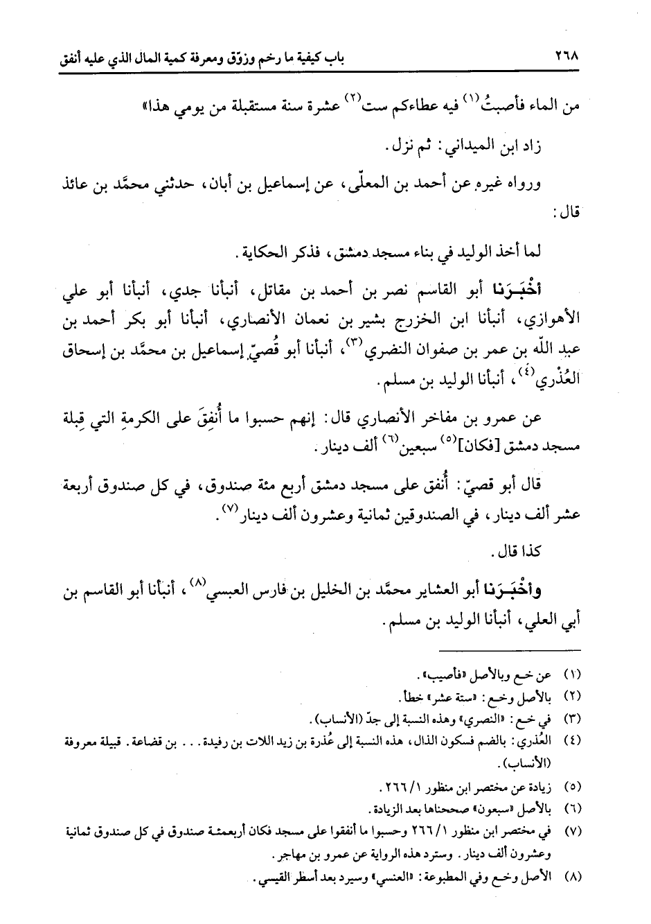 من الماء فأصبت (1) فيه عطاءكم ست (2) عشرة سنة مستقبلة من يومي هذا زاد ابن الميداني ثم نزل ورواه غيره عن أحمد بن المعلى عن إسماعيل بن أبان حدثني محمد بن عائذ قال لما أخذ الوليد في بناء مسجد دمشق فذكر الحكاية أخبرنا أبو القاسم نصر بن أحمد بن مقاتل أنبأنا جدي أنبأنا أبو علي الأهوازي أنبأنا ابن الخزرج بشير بن نعمان الأنصاري أنبأنا أبو بكر أحمد بن عبد الله بن عمر بن صفوان النضري (3) أنبأنا أبو قصي إسماعيل بن محمد بن إسحاق العذري (4) أنبأنا الوليد بن مسلم عن عمرو بن مفاخر الأنصاري قال إنهم حسبواما أنفق على الكرمة التي قبلة مسجد دمشق فكان (5) سبعين (6) ألف دينار قال أبو قصي أنفق على مسجد دمشق أربع مئة صندوق في كل صندوق أربعة عشر ألف دينار في الصندوقين ثمانية وعشرون ألف دينار (7) كذا قال وأخبرنا أبو العشاير محمد بن الخليل بن فارس العبسي (8) أنبأنا أبو القاسم بن أبي العلي أنبأنا الوليد بن مسلم
