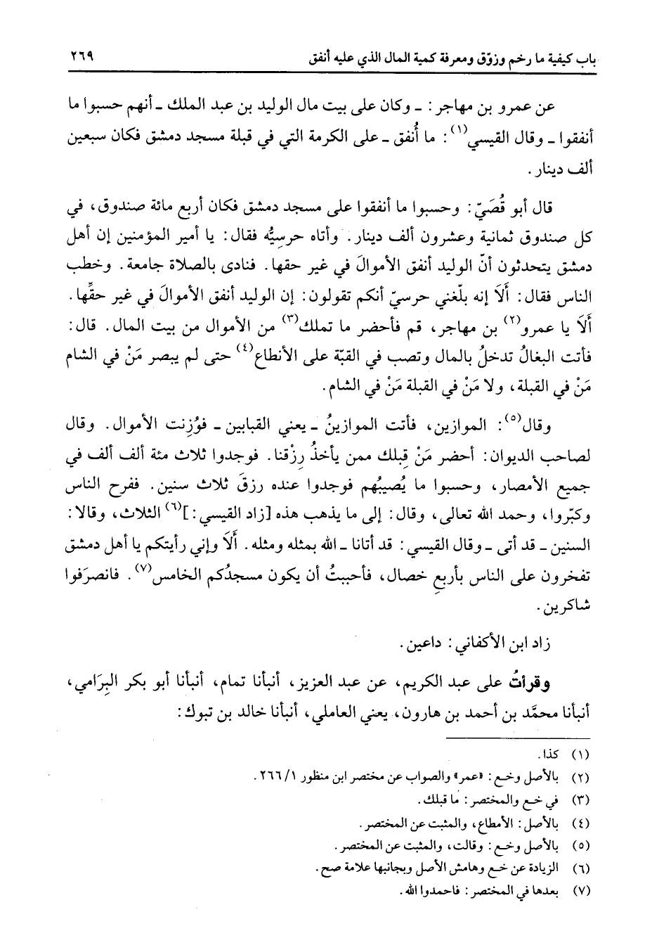 عن عمرو بن مهاجر وكان على بيت مال الوليد بن عبد الملك أنهم حسبوا ما أنفقوا وقال القيسي (1) ما أنفق على الكرمة التي في قبلة مسجد دمشق فكان سبعين ألف دينار قال أبو قصي وحسبوا ما أنفقوا على مسجد دمشق فكان أربع مائة صندوق في كل صندوق ثمانية وعشرون ألف دينار وأتاه حرسيه فقال يا أمير المؤمنين إن أهل دمشق يتحدثون أن الوليد أنفق الأموال في غير حقها فنادى بالصلاة جامعة وخطب الناس فقال ألا إنه بلغني حرسي أنكم تقولون إن الوليد أنفق الأموال في غير حقها ألا يا عمرو (2) بن مهاجر قم فأحضر ما تملك (3) من الأموال من بيت المال قال فأتت البغال تدخل بالمال وتصب في القبة على الأنطاع (4) حتى لم يبصر من في الشام من في القبلة ولا من في القبلة من في الشام وقال (5) الموازين فأتت الموازين يعني القبابين فوزنت الأموال وقال لصاحب الديوان أحضر من قبلك ممن يأخذ رزقنا فوجدوا ثلاث مئه ألف ألف في جميع الأمصار وحسبوا ما يصيبهم فوجدوا عنده رزق ثلاث سنين ففرح الناس وكبروا وحمد الله تعالى وقال إلى ما يذهب هذه زاد القيسي (6) الثلاث وقالا السنين قد أتى وقال القيسي قد أتانا الله بمثله ومثله ألا وإني رأيتكم يا أهل دمشق تفخرون على الناس بأربع خصال فأحببت أن يكون مسجدكم الخامس (7) فانصرفوا شاكرين زاد ابن الأكفاني داعين وقرأت على عبد الكريم عن عبد العزيز أنبأنا تمام أنبأنا أبو بكر البرامي أنبأنا محمد بن أحمد بن هارون يعني العاملي أنبأنا خالد بن تبوك