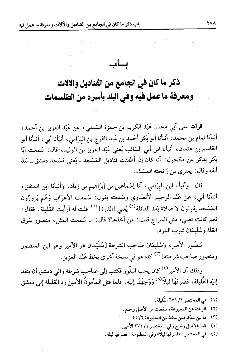 " باب ذكر ما كان في الجامع من القناديل والآلات ومعرفة ما عمل فيه وفي البلد بأسره من الطلسمات " قرأت على أبي محمد عبد الكريم بن حمزة السلمي عن عبد العزيز بن أحمد أنبأنا تمام بن محمد أنبأنا أبو بكر أحمد بن عبد الفرج بن البرامي أنبأنا أبي أنبأنا أبو القاسم بن عثمان أنبأنا ابن أبي السائب يعني عبد العزيز بن الوليد قال سمعت أبا بكر يذكر عن مكحول أنه كان إذا أطفئت قناديل المسجد يعني مسجد دمشق سد أنفه وقال يعتري من رائحته المسك قال وأنبأنا ابن البرامي أنا إسماعيل بن إبراهيم بن زياد وأنبأنا ابن المنفق أنبأنا أبي عن عبد الرحيم الأنصاري وسمعته يقول سمعت الأعراب وهم يزورون المسجد يقولون لا صلاة بعد القائلة (1) يعني الدرة (2) قلت له أرأيت القليلة فقال نعم كانت تضئ مثل السراج قلت من أخذها قال ما سمعت المثل منصور سرق القلة وسليمان شرب المرة منصور الأمير وسليمان صاحب الشرطة سليمان هو الأمير وهو ابن المنصور ومنصور صاحب شرطته (3) كذا هو في نسخة أخرى بخط عبد العزيز وذلك أن الأمير (4) كان يحب البلور فكتب إلى صاحب شرطة والي دمشق أن ينفذ إليه القليلة فصرفها ليلا (5) ووجهها إليه فلما قتل المأمون الأمين رد القليلة إلى دمشق