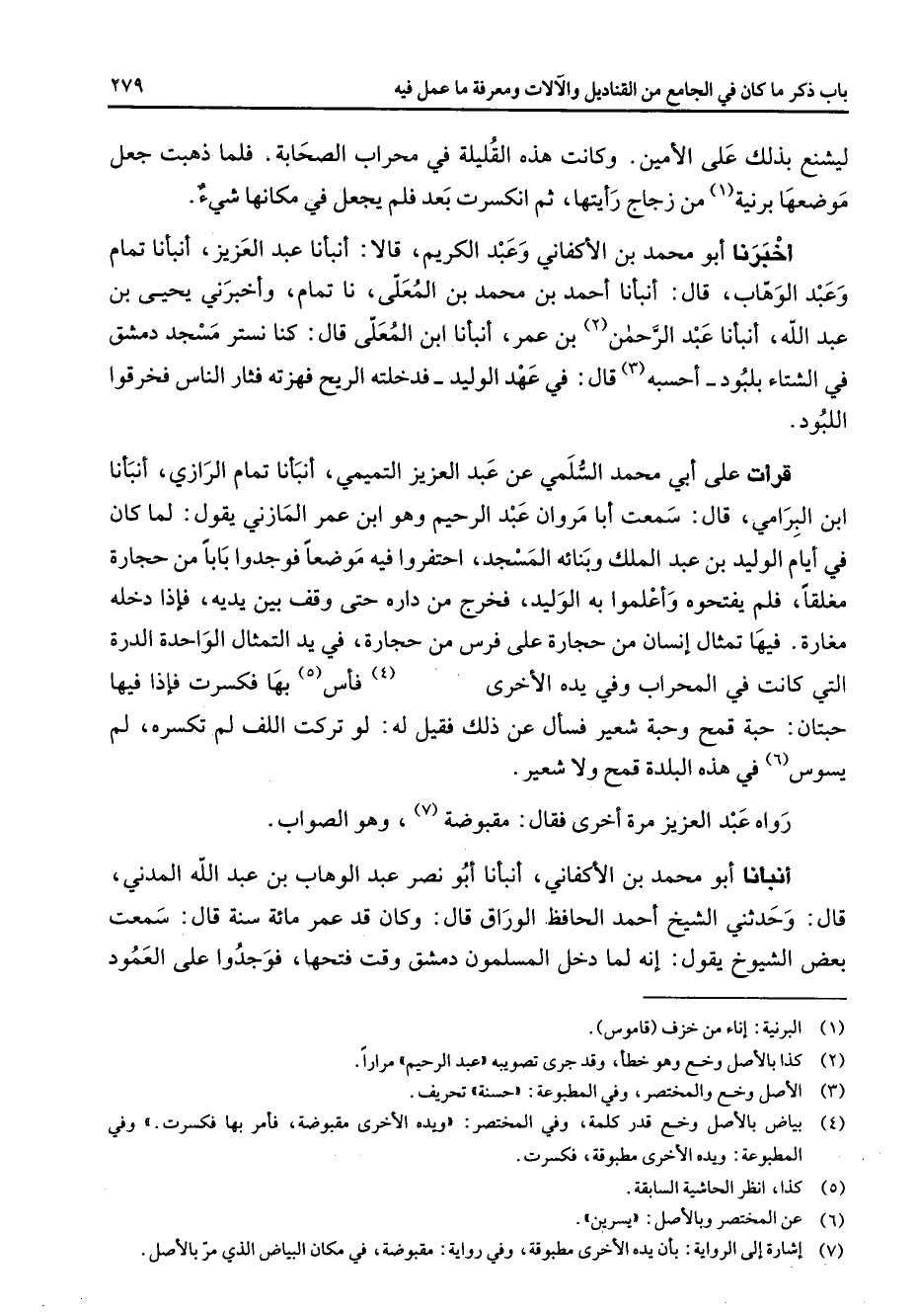 ليشنع بذلك على الأمين وكانت هذه القليلة في محراب الصحابة فلما ذهبت جعل موضعها برنية (1) من زجاج رأيتها ثم انكسرت بعد فلم يجعل في مكانها شئ أخبرنا أبو محمد بن الأكفاني وعبد الكريم قالا أنبأنا عبد العزيز أنبأنا تمام وعبد الوهاب قال أنبأنا أحمد بن محمد بن المعلى نا تمام وأخبرني يحيى بن عبد الله أنبأنا عبد الرحمن (2) بن عمر أنبأنا ابن المعلى قال كنا نستر مسجد دمشق في الشتاء بلبود أحسبه (3) قال في عهد الوليد فدخلته الريح فهزته فثار الناس فخرقوا اللبود قرأت على أبي محمد السلمي عن عبد العزيز التميمي أنبأنا تمام الرازي أنبأنا ابن البرامي قال سمعت أبا مروان عبد الرحيم وهو ابن عمر المازني يقول لما كان في أيام الوليد بن عبد الملك وبنائه المسجد احتفروا فيه موضعا فوجدوا بابا من حجارة مغلقا فلم يفتحوه وأعلموا به الوليد فخرج من داره حتى وقف بين يديه فإذا دخله مغارة فيها تمثال إنسان من حجارة على فرس من حجارة في يد التمثال الواحدة الدرة التي كانت في المحراب وفي يده الأخرى (4) فأس (5) بها فكسرت فغذا فيها حبتان حبة قمح وحبة شعير فسأل عن ذلك فقيل له لو تركت اللف لم تكسره لم يسوس (6) في هذه البلدة قمح ولا شعير رواه عبد العزيز مرة أخرى فقال مقبوضة (7) وهو الصواب أنبأنا أبو محمد بن الأكفاني أنبأنا أبو نصر عبد الوهاب بن عبد الله المدني قال وحدثني الشيخ أحمد الحافظ الوراق قال وكان قد عمر مائة سنة قال سمعت بعض الشيوخ يقول إنه لما دخل المسلمون دمشق وقت فتحها فوجدوا على العمود