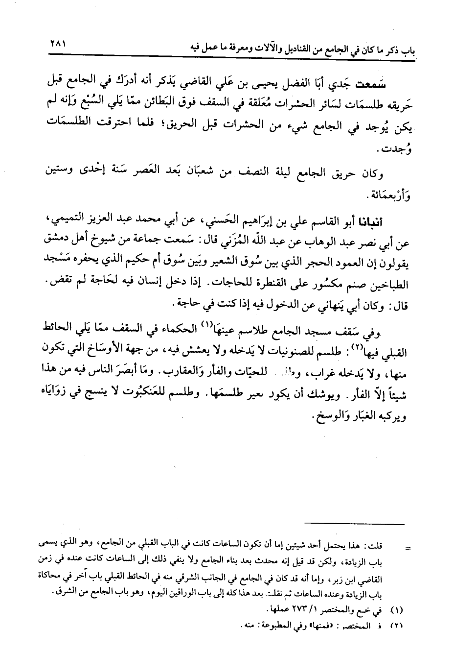 سمعت جدي أبا الفضل يحيى بن علي القاضي يذكر أنه أدرك في الجامع قبل حريقه طلسمات لسائر الحشرات معلقة في السقف فوق البطائن مما يلي السبع وإنه لم يكن يوجد في الجامع شئ من الحشرات قبل الحريق فلما احترقت الطلسمات وجدت وكان حريق الجامع ليلة النصف من شعبان بعد العصر سنة إحدى وستين وأربعمائة أنبأنا أبو القاسم علي بن إبراهيم الحسني عن أبي محمد عبد العزيز التميمي عن أبي نصر عبد الوهاب عن عبد الله المزني قال سمعت جماعة من شيوخ أهل دمشق يقولون إن العمود الحجر الذي بين سوق الشعير وبين سوق أم حكيم الذي يحفره مسجد الطباخين صنم مكسور على القنطرة للحاجات إذا دخل إنسان فيه لحاجة لم تقض قال وكان ابي ينهاني عن الدخول فيه إذا كنت في حاجة وفي سقف مسجد الجامع طلاسم عينها (1) الحكماء في السقف مما يلي الحائط القبلي فيها (2) طلسم للصنونيات لا يدخله ولا يعشش فيه من جهة الأوساخ التي تكون منها ولا يدخله غراب وطلسم للحيات والفأر والعقارب وما أبصر الناس فيه من هذا شيئا إلا الفأر ويوشك أن يكون بعير طلسمها وطلسم للعنكبوت لا ينسج في زواياه ويركبه الغبار والوسخ