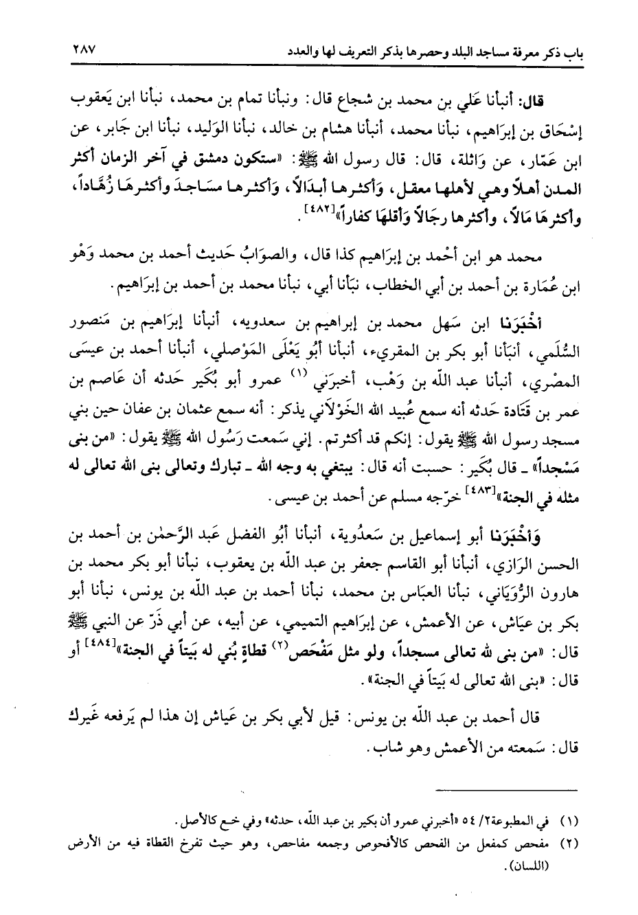 [482] محمد هو ابن أحمد بن إبراهيم كذا قال والصواب حديث أحمد بن محمد وهو ابن عمارة بن أحمد بن أبي الخطاب نبأنا أبي نبأنا محمد بن أحمد بن إبراهيم أخبرنا ابن سهل محمد بن إبراهيم بن سعدويه أنبأنا إبراهيم بن منصور السلمي أنبأنا أبو بكر بن المقرئ أنبأنا أبو يعلى الموصلي أنبأنا أحمد بن عيسى المصري أنبأنا عبد الله بن وهب أخبرني (1) عمرو أبو بكير حدثه أن عاصم بن عمر بن قتادة حدثه أنه سمع عبيد الله الخولاني يذكر أنه سمع عثمان بن عفان حين بني مسجد رسول الله (صلى الله عليه وسلم) يقول إنكم قد أكثرتم إني سمعت رسول الله (صلى الله عليه وسلم) يقول من بنى مسجدا قال بكير حسبت أنه قال يبتغي به وجه الله تبارك وتعالى بنى الله تعالى له مثله في الجنة
