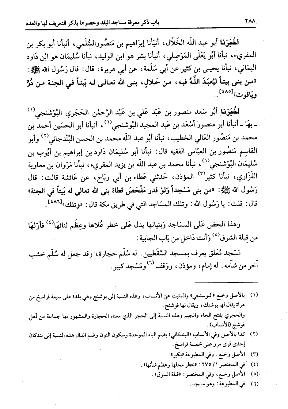 [485] أخبرنا أبو سعد منصور بن عبد علي بن عبد الرحمن الحجري البوشنجي (1) بها أنبأنا أبو منصور أسعد بن عبد المجيد البوشنجي (1) أنبأنا أبو الحسين أحمد بن محمد بن منصور العالي الخطيب نبأنا أبو عبد الله محمد بن الحسن البندجاني (2) وأبو القاسم منصور بن العباس الفقيه قال نبأنا أبو سليمان داود بن إبراهيم بن أيوب بن سليمان البوشنجي (1) نبأنا محمد بن عبد الله بن يزيد المقرئ نبأنا مروان بن معاوية الفزاري نبأنا كثير (3) المؤذن حدثني عطاء بن أبي رباح عن عائشة قالت قال رسول الله (صلى الله عليه وسلم) " من بنى مسجدا ولو قدر مفحص قطاة بنى الله تعالى له بيتا في الجنة " قال قلت يا رسول الله وتلك المساجد التي في طريق مكة قال وتلك