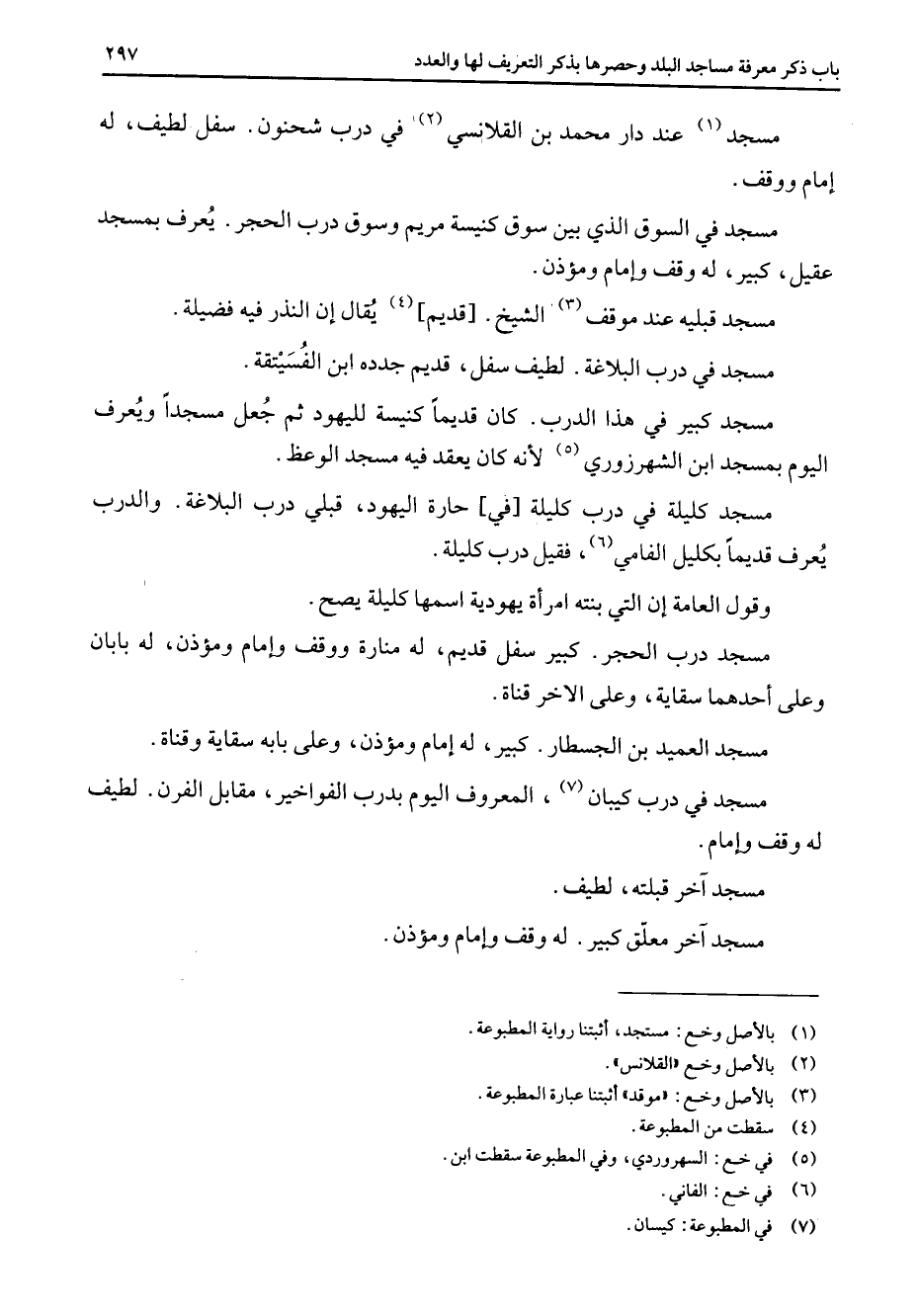 مسجد (1) عند دار محمد بن القلانسي (2) في درب شحنون سفل لطيف له إمام ووقف مسجد في السوق الذي بين سوق كنيسة مريم وسوق درب الحجر يعرف بمسجد عقيل كبير له وقف وإمام ومؤذن مسجد قبليه عند موقف (3) الشيخ قديم (4) يقال إن النذر فيه فضيلة مسجد في درب البلاغة لطيف سفل قديم جدده ابن الفسيتقة مسجد كبير في هذا الدرب كان قديما كنيسة لليهود ثم جعل مسجدا ويعرف اليوم بمسجد ابن الشهرزوري (5) لأنه كان يعقد فيه مسجد الوعظ مسجد كليلة في درب كليلة في حارة اليهود قبلي درب البلاغة والدرب يعرف قديما بكليل الفامي (6) فقيل درب كليلة وقول العامة إن التي بنته امرأة يهودية اسمها كليلة يصح مسجد درب الحجر كبير سفل قديم له منارة ووقف وإمام ومؤذن له بابان وعلى أحدهما سقاية وعلى الآخر قناة مسجد العميد بن الجسطار كبير له إمام ومؤذن وعلى بابه سقاية وقناة مسجد في درب كيبان (7) المعروف اليوم بدرب الفواخير مقابل الفرن لطيف له وقف وإمام مسجد آخر قبلته لطيف مسجد آخر معلق كبير له وقف وإمام ومؤذن