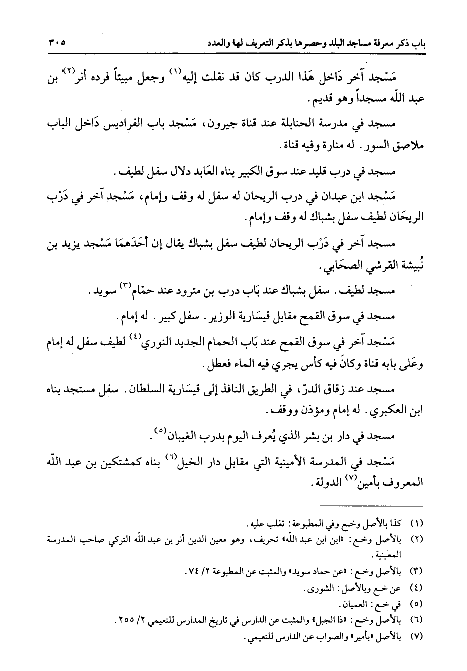 مسجد آخر داخل هذا الدرب كان قد نقلت إليه وجعل مبيتا فرده أنر بن عبد الله مسجدا وهو قديم مسجد في مدرسة الحنابلة عند قناة جيرون مسجد باب الفراديس داخل الباب ملاصق السور له منارة وفيه قناة مسجد في درب قليد عند سوق الكبير بناه العابد دلال سفل لطيف مسجد ابن عبدان في درب الريحان له سفل له وقف وإمام مسجد آخر في درب الريحان لطيف سفل بشباك له وقف وإمام مسجد آخر في درب الريحان لطيف سفل بشباك يقال إن أحدهما مسجد يزيد بن نبيشة القرشي الصحابي مسجد لطيف سفل بشباك عند باب درب بن مترود عند حمام سويد مسجد في سوق القمح مقابل قيسارية الوزير سفل كبير له إمام مسجد آخر في سوق القمح عند باب الحمام الجديد النوري لطيف سفل له إمام وعلى بابه قناة وكان فيه كأس يجري فيه الماء فعطل مسجد عند زقاق الدر في الطريق النافذ إلى قيسارية السلطان سفل مستجد بناه ابن العكبري له إمام ومؤذن ووقف مسجد في دار بن بشر الذي يعرف اليوم بدرب الغيبان مسجد في المدرسة الأمينية التي مقابل دار الخيل بناه كمشتكين بن عبد الله المعروف بأمين الدولة