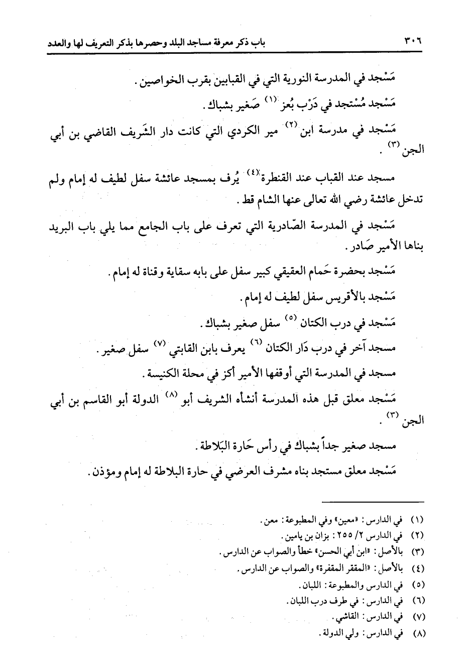 مسجد في المدرسة النورية التي في القبابين بقرب الخواصين مسجد مستجد في درب بعز (1) صغير بشباك مسجد في مدرسة ابن (2) مير الكردي التي كانت دار الشريف القاضي بن أبي الجن (3) مسجد عند القباب عند القنطرة (4) يرف بمسجد عائشة سفل لطيف له إمام ولم تدخل عائشة رضي الله تعالى عنها الشام قط مسجد في المدرسة الصادرية التي تعرف على باب الجامع مما يلي باب البريد بناها الأمير صادر مسجد بحضرة حمام العقيقي كبير سفل على بابه سقاية وقناة له إمام مسجد بالأقريس سفل لطيف له إمام مسجد في درب الكتان (5) سفل صغير بشباك مسجد آخر في درب دار الكتان (6) يعرف بابن القابتي (7) سفل صغير مسجد في المدرسة التي أوقفها الأمير أكز في محلة الكنيسة مسجد معلق قبل هذه المدرسة أنشأه الشريف أبو (8) الدولة أبو القاسم بن أبي الجن (3) مسجد صغير جدا بشباك في رأس حارة البلاطة مسجد معلق مستجد بناه مشرف العرضي في حارة البلاطة له إمام ومؤذن