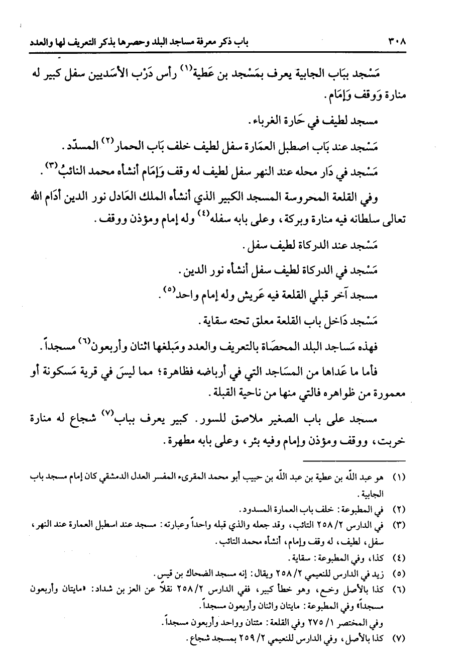 مسجد بباب الجابية يعرف بمسجد بن عطية رأس درب الأسديين سفل كبير له منارة ووقف وإمام مسجد لطيف في حارة الغرباء مسجد عند باب اصطبل العمارة سفل لطيف خلف باب الحمار المسدد مسجد في دار محله عند النهر سفل لطيف له وقف وإمام أنشأه محمد النائب وفي القلعة المحروسة المسجد الكبير الذي أنشأه الملك العادل نور الدين أدام الله تعالى سلطانه فيه منارة وبركة وعلى بابه سفله وله إمام ومؤذن ووقف مسجد عند الدركاة لطيف سفل مسجد في الدركاة لطيف سفل أنشأه نور الدين مسجد آخر قبلي القلعة فيه عريش وله إمام واحد مسجد داخل باب القلعة معلق تحته سقاية فهذه مساجد البلد المحصاة بالتعريف والعدد ومبلغها اثنان وأربعون مسجدا فأما ما عداها من المساجد التي في أرباضه فظاهرة مما ليس في قرية مسكونة أو معمورة من ظواهره فالتي منها من ناحية القبلة مسجد على باب الصغير ملاصق للسور كبير يعرف بباب شجاع له منارة خربت ووقف